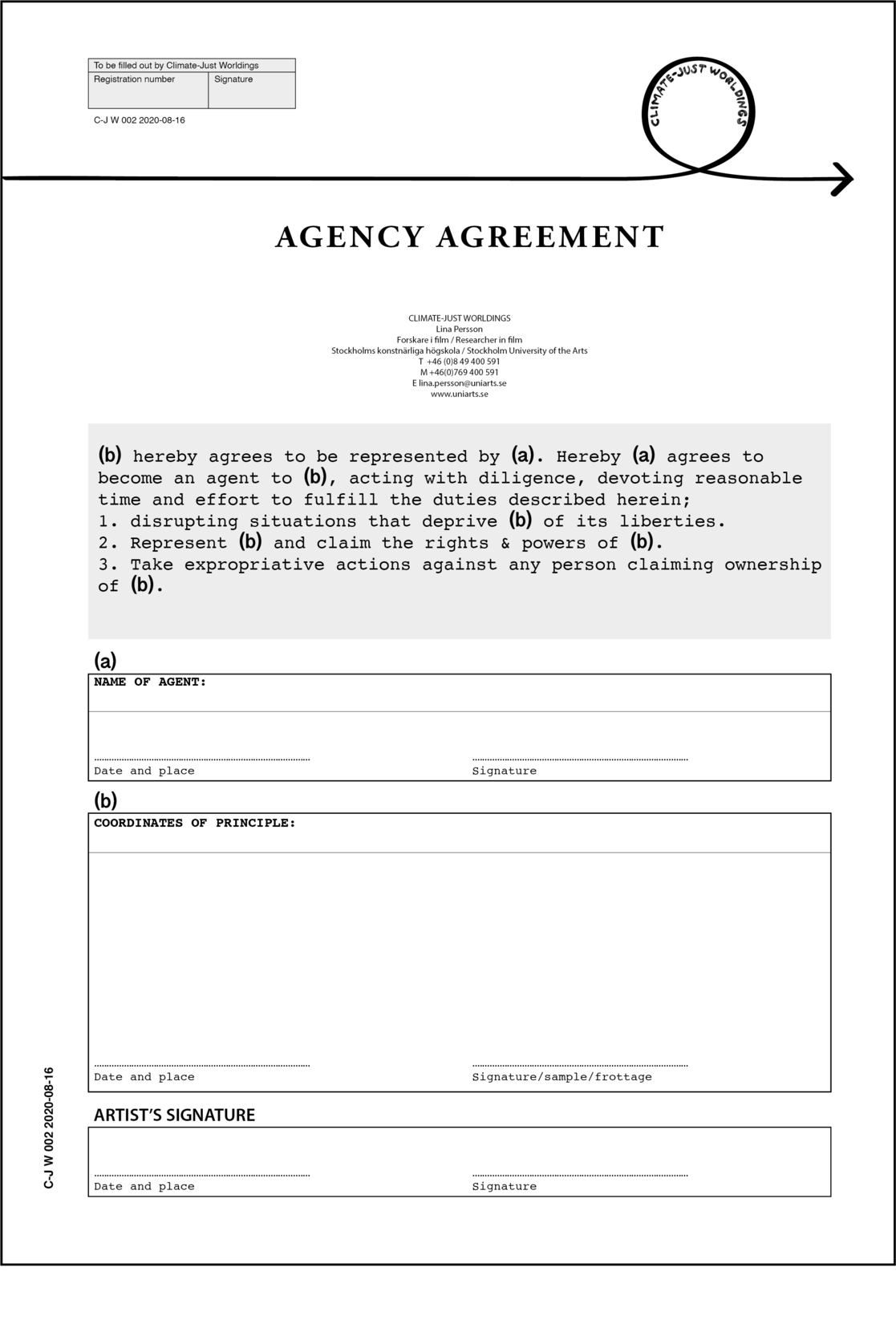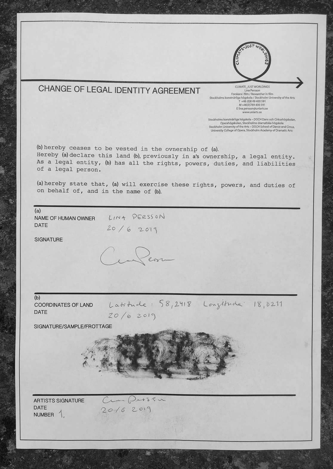 Do you own land that you want to set free? Then you can sign this agreement. Download, print two copies, sign the agreement together with the land. Send both copies to Lina Persson, Climate-Just Worldings, Stockholms Konstnärliga Högskola, Valhallavägen 189, 115 53 Stockholm. You will recieve one copy back in the mail, with the artist's signature. The other copy will be part of a growing archive within the research project Climate-Just Worldings. You can also contact lina.persson@uniarts.se to have two printed copies sent to you.