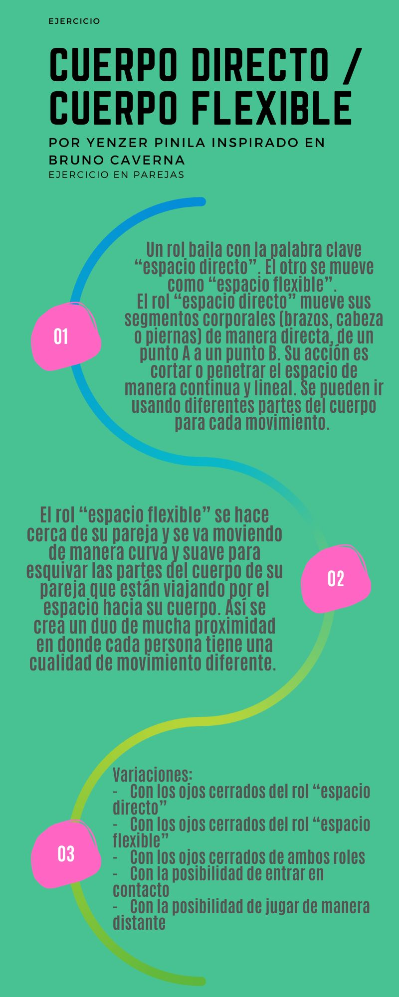 Así, el maestro o maestra con enfoque inclusivo se integra a este tejido interpersonal, alejándose del lugar del poder y el conocimiento para abrirse a la escucha del grupo. En lugar de liderar desde el frente, adoptan una posición de apoyo desde todos los lados, potenciando a cada persona en lugar de imponer o exigir un modelo preestablecido. Este modo de ser informa sus modos de hacer, permitiendo clases accesibles donde todas las personas tienen espacio para crecer. Para Marian Mateus, maestra y gestora de Tunja, resulta fundamental dar espacio a la necesidad de sorprenderse. “Se trata de proponer algunas pautas en las cuales se despierte la sorpresa y al mismo tiempo sorprenderse con aquello que aparece en lo que se ha hecho una y otra vez.” La capacidad de sorprenderse consiste, tal vez, en que aquello que ocurre, está bien, independientemente del plan original. Para ella, el modo de hacer se construye desde la diversidad y de quedarse en el presente. Se trata de la relación que se establece entre la voz guía que propone un ejercicio y el tiempo que a cada participante le toma estudiarlo y experienciarlo. El tiempo de esta experimentación no es el mismo para todos, por lo que resulta más que sorprendente cuando tiempos discontinuos logran armonizarse al unísono tras la modificación o adaptación de una pauta.