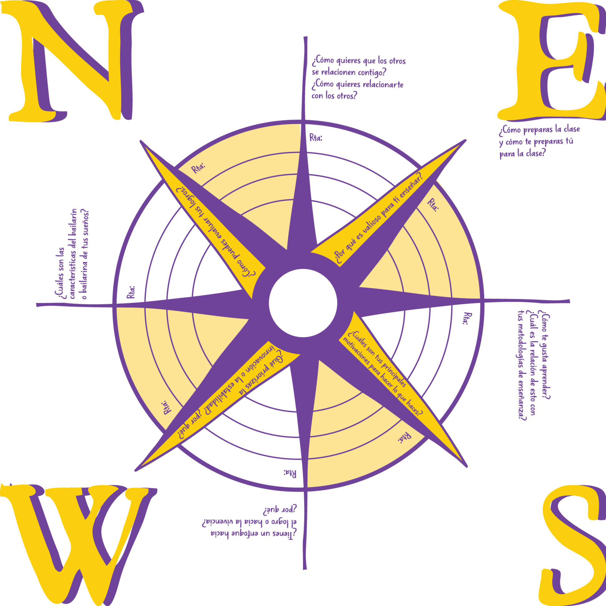 Finalmente, se realizó la tercera actividad gráfica en donde cada quien, siguiendo la metáfora de la brújula que marca el camino de los barcos en alta mar, dibujó su propia Rosa de los Vientos para su trabajo docente de inclusión. Por ello, cada quien plasmó todo aquello que es esencial en su concepción de la danza y que guía su práctica pedagógica accesible. Esto permitió llevar el foco a los principios de la práctica más que a las formas o pasos. De esta manera, es posible diseñar metodologías que sean accesibles para todos y todas. En las rosas de los y las participantes se evidenció que es fundamental la perseverancia, la creatividad, la experimentación y la valentía. Estos valores permiten insistir en la inclusión como práctica que no concerniente solamente a las personas en condición de discapacidad, sino que es una herramienta de transformación social en colectivo, que logra re-significar el cuerpo territorial e individual como semilla de creación.