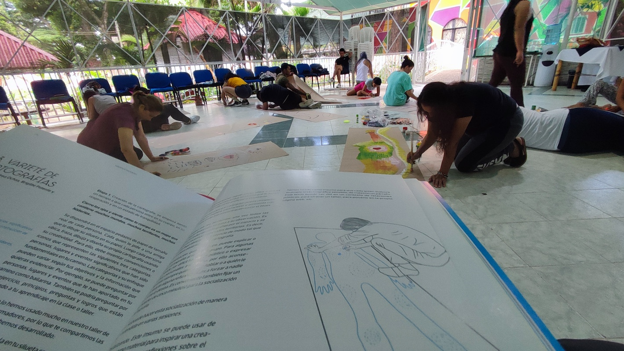 Este viaje introspectivo sensibilizó y preparó a los y las participantes para la expresión gráfica. Así, cada participante dibujó la silueta de su cuerpo sobre una gran hoja de papel como ese territorio donde se encuentran los trazos y las huellas de sus experiencias. Cada silueta fue llenada con las representaciones de los lugares, personas y eventos que han sido significativos e importantes a la hora de moldear su práctica pedagógica. Al final, se hizo una suerte de galería donde se expusieron todas las cartografías y algunos de los y las participantes contaron sobre el contenido de su silueta a las demás personas del grupo.