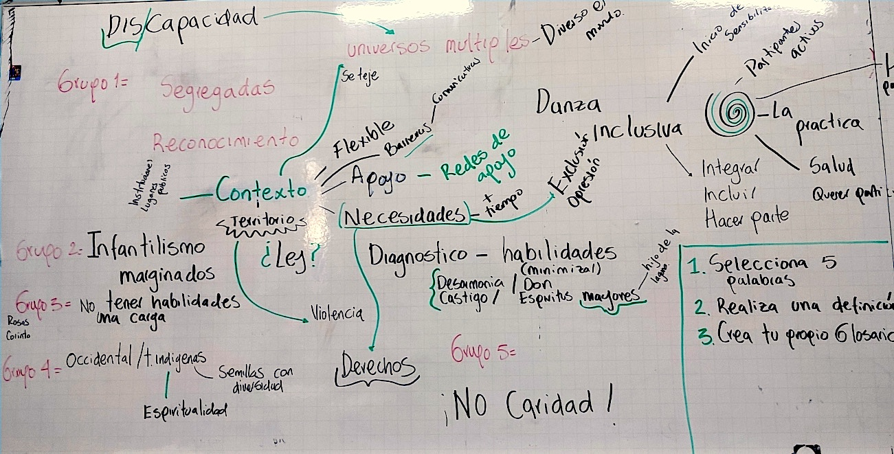 Además de proponer exploraciones de movimiento, los talleres incluyeron espacios de reflexión fundamentales sobre la discapacidad y su lugar en el arte. A través de preguntas como: ¿En tu región, cómo es percibida una persona con discapacidad?, ¿Dónde ocurre la discapacidad, en la persona o en las estructuras sociales?; y otras que relacionan arte y pedagogía, como: ¿Para qué se hace danza inclusiva?, ¿Qué entiendes por un proceso de inclusión en la formación en danza?, o ¿Por qué es importante que las personas con discapacidad también bailen?, se fomentó un diálogo crítico y abierto sobre percepciones y experiencias vinculadas a la discapacidad.
