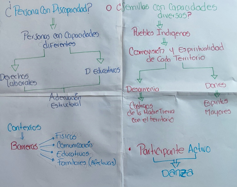 “Si hablamos de que la discapacidad es una desarmonía, los mayores señalan que bien puede ser a causa de un castigo de la Madre Tierra hacia el territorio o hacia cierta comunidad. Por otro lado, se habla de semillas con capacidades diversas como un don otorgado por los espíritus mayores. Algunas comunidades identifican a las personas con discapacidad como hijos del trueno, del árbol o de la laguna. En nuestro territorio, se ha establecido que una persona con discapacidad es hijo del Cayu, el nombre de un espíritu mayor que nos orienta”. – Orlando Uní Joaqui, participante del taller en Popayán.