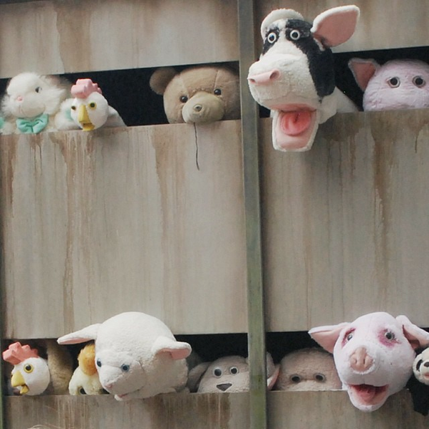 De bioindustrie die wordt verbeeld aan de hand van knuffels in een truck. Ze kijken angstig en alsof ze pijn hebben. Hier krijg ik gelijk meedelijden mee!