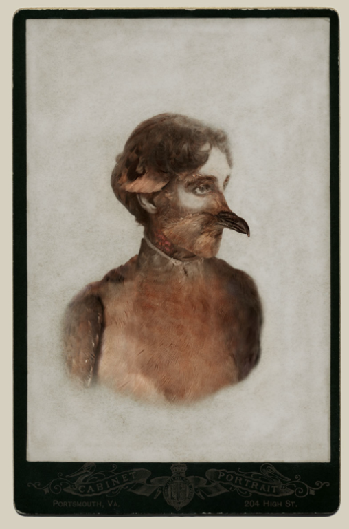 Een uitgestorven soort door de mens (passenger pigeon) en de mens vermengd in een portret.