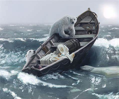 Ijsberen waarvan hun leefomgeving afneemt en een reddingsboot inklimmen. Waarbij de ijsbeer in het midden je aan kijkt en in mijn ogen om hulp vraagt.