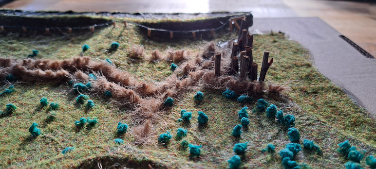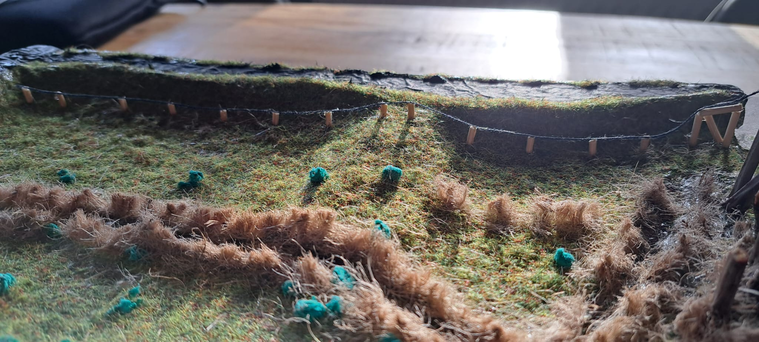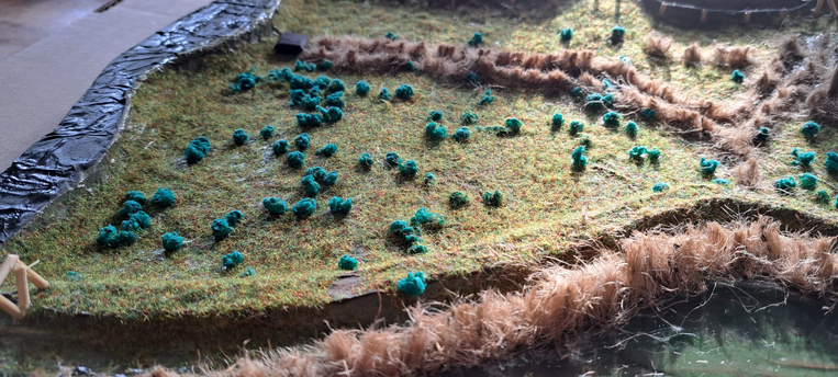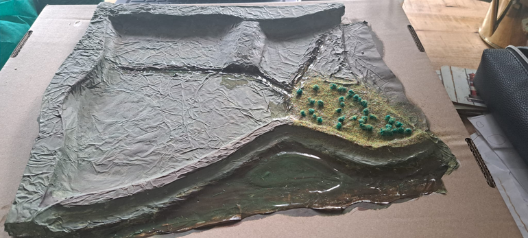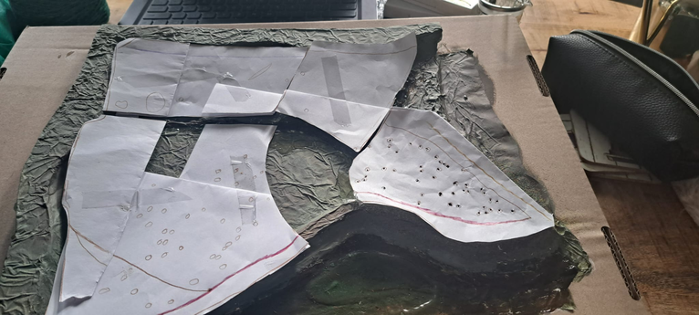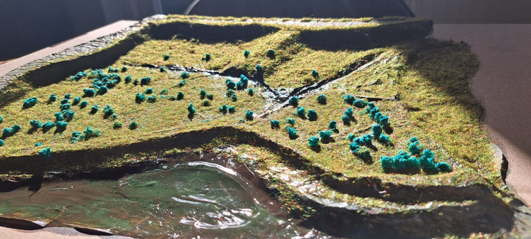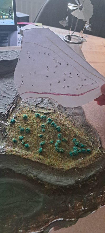 Visualisatie: Voor het embedded onderzoek ben ik +/- 4uur in het gebied geweest en heb ik mij geprobeerd te verplaatsen in het gebied. Om het gebied in een visualisatie meer te laten leven heb ik een maquette gemaakt. In de gebied heb ik gefocust op de meest opvallende aspecten in het gebied. De dijk, de nevengeul, de sloten, het riet, de meidoorns, het hek en het wilgenbos vlak bij de ingang.