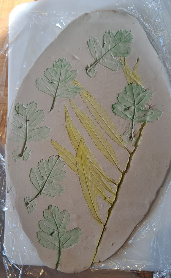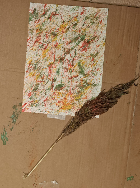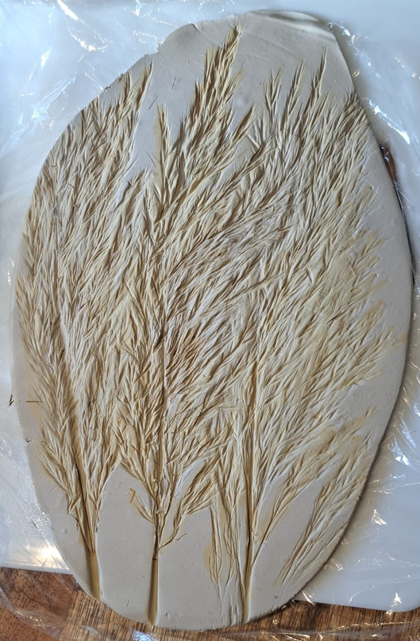 Visualisatie: Riet is typerende soort voor het uiterwaarden gebied in Wageningen. Ik wilde dan ook graag deze soort en het gevoel er van "vastleggen". Dit heb ik gedaan door een rietpluim als kwast te gebruiken en daarmee de structuur met verf op papier te zetten. Je ziet nu het patroon van het riet terug. Dit heb ik ook gedaan door een afdruk in klei te maken (zie hieronder). Dit heb ik ook gedaan met het blad van de meidoorn en wilg die ook typerend voor het gebied zijn.
