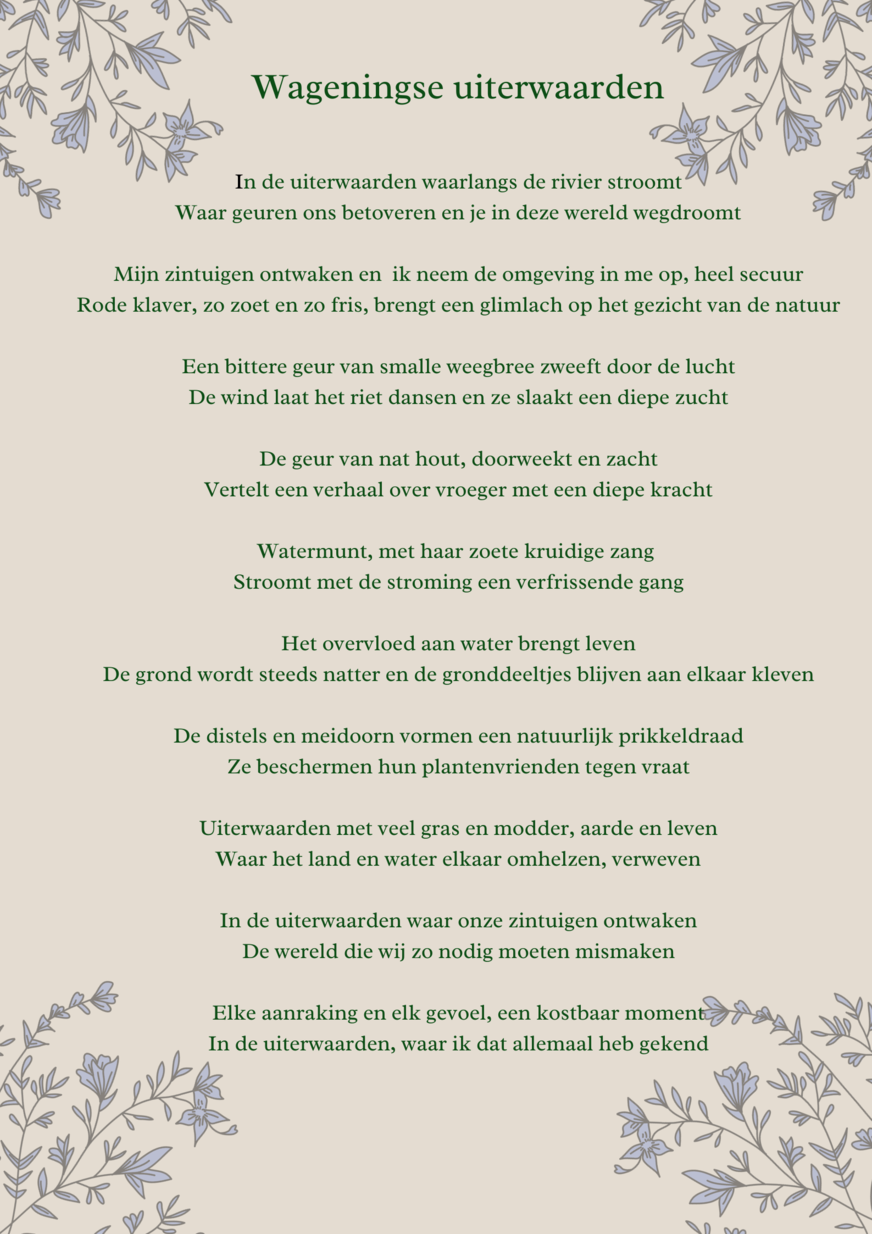 Embedded: Voor het embedded onderzoek wil ik mij inleven in het uiterwaarden gebied. Ik wil stilstaan en kijken wat mij opvalt wanneer ik voor langere tijd in het gebied aanwezig ben. Hierbij reflecteer ik op mijn eigen ervaring. Daarnaast maak ik een maquette om het gebied in 3d vast te leggen.