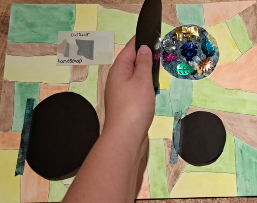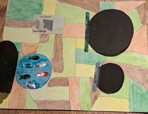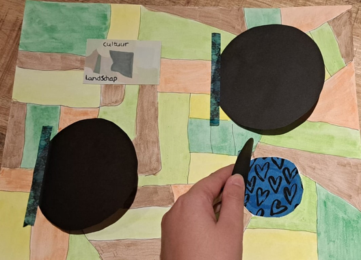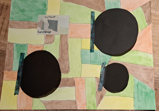 In deze collage is het cultuurlandschap vanaf boven af te zien. Een lappendeken van land dat in hokjes is opgedeeld en vaak met afscheidingen er tussen. Dit is voor ons de realiteit waarmee we opgroeien. In het cultuurlandschap zie je drie zwarte circkels, dit zijn de gaten in ons geheugen. Zo zie je op de 2e foto het aquatische ecosysteem die rijk is aan soorten. Door vervuiling en overbevissing gaat het niet goed met zoet- en zoutwater ecosystemen. De soorten nemen af en soorten worden steeds kleiner doordat er te veel wordt weggevangen en ze geen tijd meer krijgen om groot te groeien. In de 2e circkel (linksonder) is het ecosysteem op land te zien, waarin ook steeds meer soorten afnemen en zelfs uitsterven. Tot slot zie je een circkel met hartjes die staat voor de verbondenheid die wij als mens met de natuur hebben. Veel mensen voelen zich niet meer verbonden met de natuur en zelfs veel mensen weten/begrijpen niet dat wij afhankelijk zijn van de natuur.