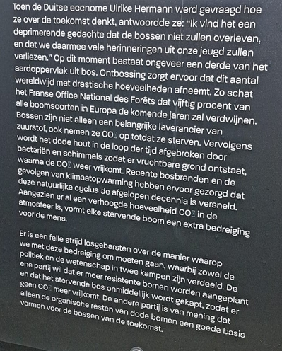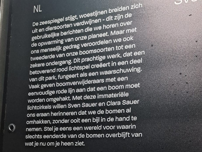 Op 14 oktober ging ik naar Schemerlicht in Nijmegen. Het thema was aarde. De kunstenaars maken zoals de naam ook al zegt vooral gebruik van licht maar ook audio was regelmatig te horen. Zo was er bijvoorbeeld een gedicht te horen over bomen vanuit het perspectief van de bomen. De bomen hadden ook allemaal en raakten een vriend kwijt doordat deze werd omgepakt. Op deze manier werd er aandacht gevraagd voor ontbossing. Daarnaast waren er verschillende rode ringen van licht om bomen te zien vervolgens hoorde je een harde kettingzaak en zag je één voor één de rode lichten gaan knipperen en vervolgens uitdoven. De rode lichten stonden symbool voor de rode markeringen die bomen krijgen wanneer ze omgezaagd moeten worden. Dit werk heeft die avond de meeste indruk om mij gemaakt.
