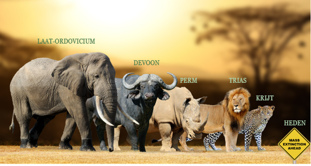 Er zijn vijf grote massa uitstervingen geweest, ook wel de big 5 genoemd. Op het moment sterven er in een snel tempo veel soorten uit. Sommigen wetenschappers benoemen dat de 6e massa-extinctie nu bezig is.