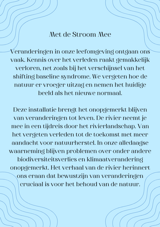 Hoe wil ik dit gaan doen: Het verleden, heden, toekomst van riviernatuur laten zien. Ik wil de bezoekers als het ware een tijdreis laten maken door het rivierlandschap heen.