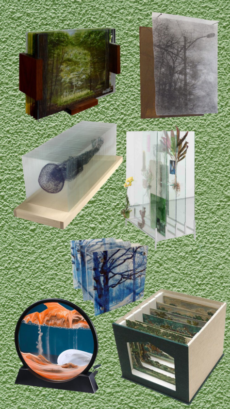 Idee: 3 glazen panelen waarop van achter naar voor het verleden tot aan de toekomst te zien is. Het is de bedoeling dat het heden het meest duidelijke beeld is en dat het verleden op de achtergrond wazig is maar wel te zien is. De toekomst is ook nog een vaag beeld, maar gericht op natuurherstel. Bij dit beeld is audio te horen, via een koptelefoon, over wat je op de afbeeldingen ziet.