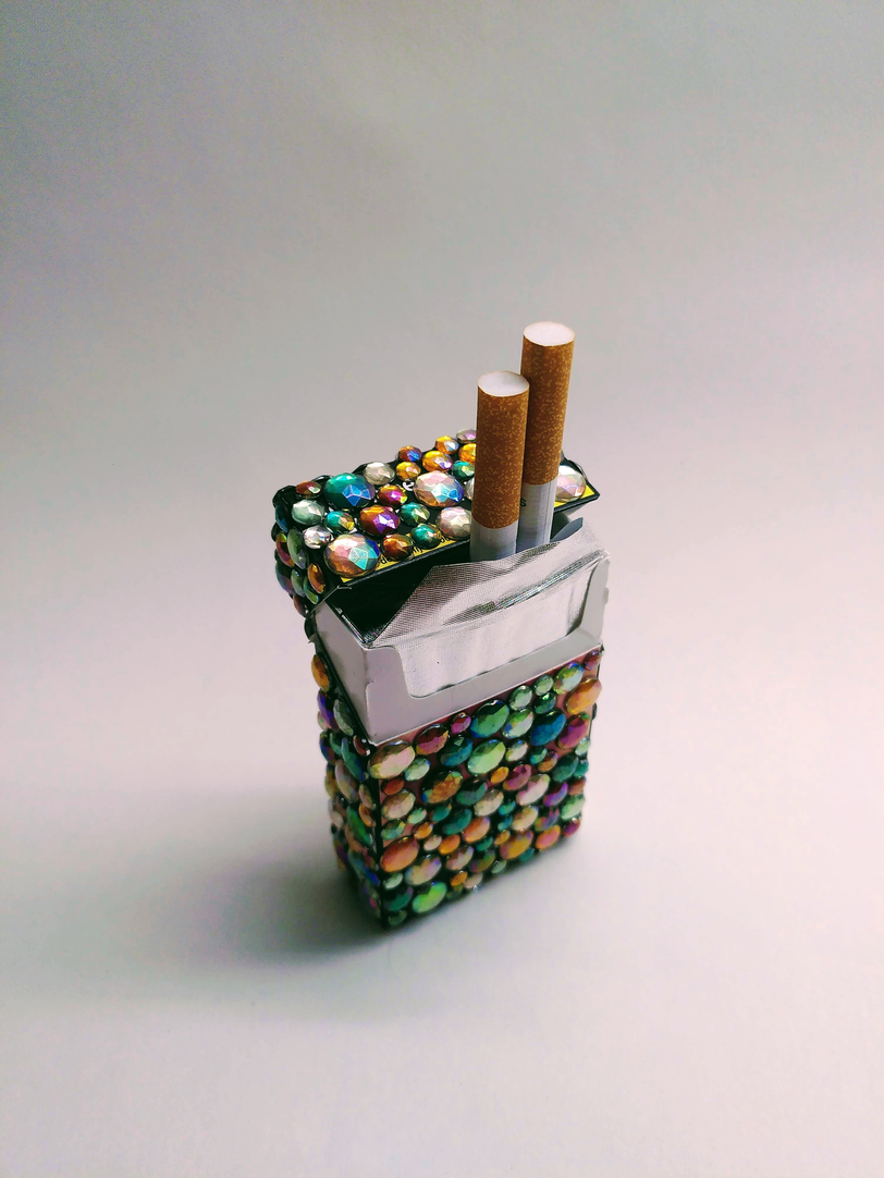 PROVO TYPING Op de master leerde ik het woord provotyping. Voor mij betekent het een beeld/werk/onderzoek ontwikkelen dat provoceert en mensen aan het denken zet. Ik herkende mijn eigen glittertampon in dit woord. Bizar genoeg onstond op hetzelfde moment dat ik met het woord provotyping in aanraking kwam het werk 'Jur his destruction'. Een pakje Gouloises blauw dat ik beglitterde met diamnt stickers. Een werk als cadeau aan een vriend als verbeelding van een groot transformatief proces. Ik ging nadenken over zijn grote destructie. Omdat hoe destructief deze transformatie ook is, het ook iets moois in gang zou zetten.Zo ontstond dit werk. En het ging niet over stoppen met roken.