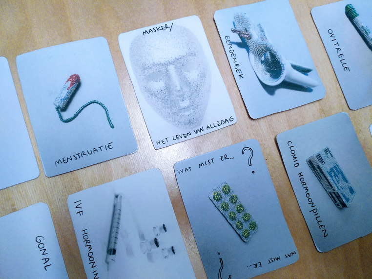 MINI MASTER PROTOTYPE Voor de Mini Master ontwikkelen we een prototype spel dat ons laat nadenken over wat we willen bereiken met ons onderzoek. Maar ook een oefening in hoe je met stakeholders in gesprek kan gaan. Voor mij is het op dit moment relevant om in gesprek te gaan met andere ervaringsdeskundigen. Dat kan via interviews, maar hoe zorg ik dat ik in kaart krijg waar de emoties en struggles voor anderen liggen, met zo'n persoonlijk en belanden onderwerp? Ik ontwikkel een kaartenspel met het doel een inzicht te krijgen in de abstracties en emoties die gepaard gaan met een fertiliteitstraject, door spelers een opstelling te laten maken van 12 attributen uit een vruchtbaarheidsbehandeling. In eerste instantie had ik alleen nog de kaartjes.Toen ik het ging spelen legde ik de kaarten op volgorde van begin naar eind. Maar dat gaf me geen diepgang. Dus ik ging terug naar de mechanics, dynamics en aestetics waar ik de kaarten: searching, listenening en creating in had gezet. Searching: erachter komen wat er achter iets ligt. 'Een hidden truth'. Hoe kom ik daar? Ik dacht aan familieopstellingen, hoe je in plaatsing van poppetjes verbanden leert zien. Dus ik besloot de regel; maak een opstelling. Toen ik zelf het spel speelde werd dat meteen interessant. De kaarten anticonceptie, spermapotje en geplande seks kwamen meteen rechts van het masker te liggen; die stonden (voor mij) voor relatoneel. Boven het masker legde ik de tampon en testen; die voelen eenzaam. De attributen links, bij elkaar gepropt. Ik keek ernaar en vroeg me af: wat is die eenzaamheid? En daarna hoe zorg ik dat ik hier content uit krijg dat ik kan gebruiken voor het onderzoek.