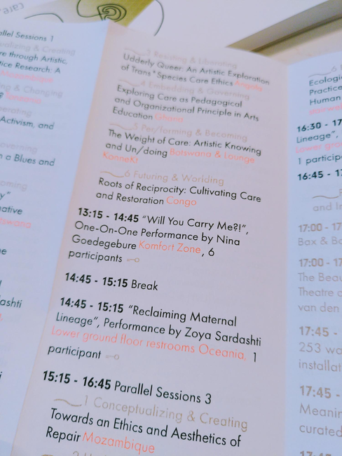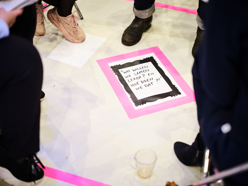 ONDERZOEK Als coordinator ben ik betrokken bij de SPRONG Creating Cultures of Care. Een beweging / samenwerkingsverband van 9 lectoraten en diverse partners die onderzoek doen naar hoe we de zorg kunnen verbeteren aan de hand van kunst en ontwerp. Ik ontwierp o.a. mee aan het event de Kunst Salon op 13 november 2023, waarin werd gesproken over thema's en vragen die in het werkveld / CareLabs naar boven komen. Zoals vanuit de Universiteit Utrecht; Wat willen we samen leren? En hoe doen we dat? Ik was verantwoordelijk voor de aankleding. Ik koos voor neonroze kaders, schots en scheef staande opklapstoeltjes binnen deze kaders en schreef de hoofdvragen met de hand op papier.