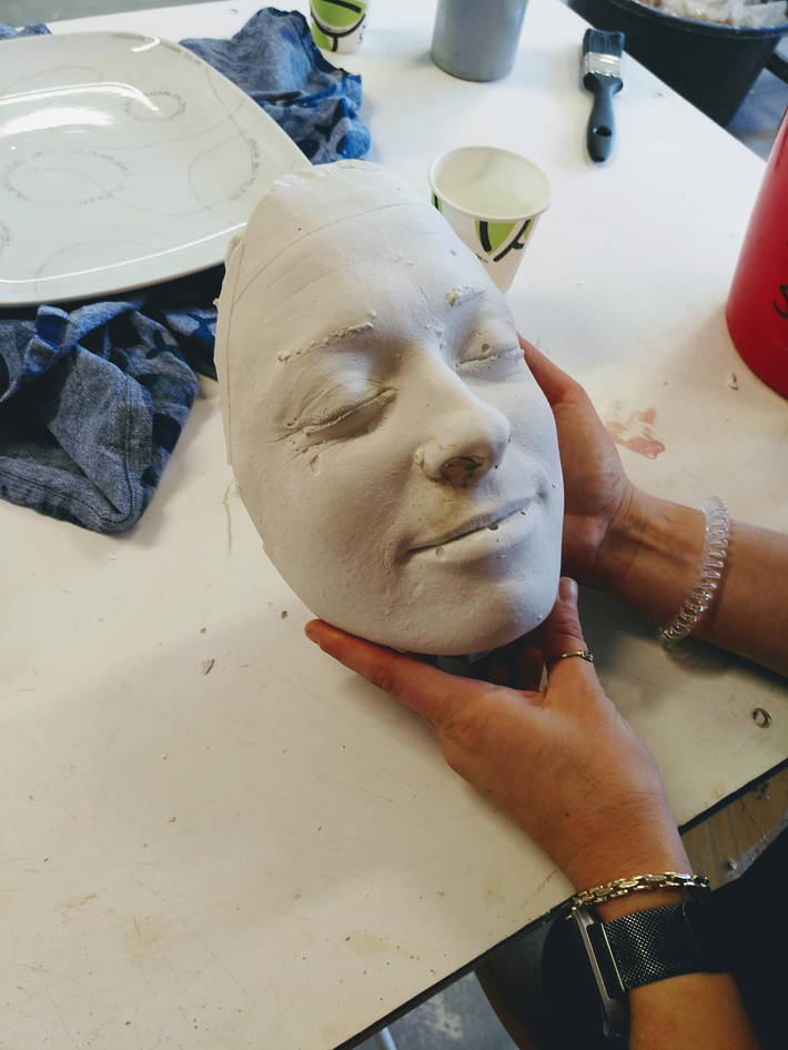 Het ontroert me. Het is alsof ik de binnenkant van mijn gezicht kan zien. Of ik de binnenkant van mezelf kan zien. Alsof ik mezelf vast heb en dat voelt heel rustig en fijn. Als ik later een afgietsel maak van deze mal en mijn gezicht uit de mal komt is het helemaal bizar. Het gezicht, mijn gezicht, is warm door de reactie van het gips. Ik zie een lichte glimlach, kleine lijntjes bij mijn ogen. ‘Hij is heel mooi geworden', zegt Jeroen. En dat vind ik ook.