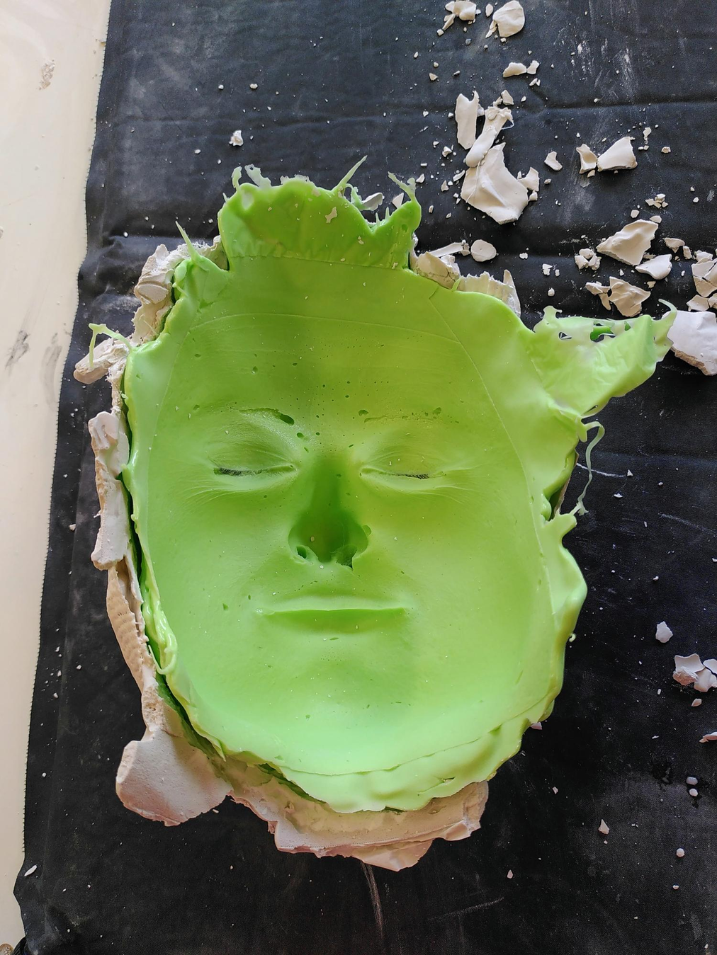 Ik voel de warmte reactie, hoe de mal zwaarder wordt. Een aanraking op mijn arm van Maya. Voelde ik bij de siliconen nog enige vrijheid in mijn gezicht, nu zit ik vast. Als ik beweeg, voel ik hoe strak alles zit. Dat is iets dat ik moet incasseren, accepteren. Gewoon blijven ademen. Gewoon blijven ademen. En dan mag ik rechtop. Een hand van Jeroen, 'ga maar zitten'. 'Pak de rietjes er maar uit.' Minder lucht. 'Pak je gezicht maar vast en probeer de mal eraf te trekken.' Dat lukt niet. ‘Nee, je moet grimassen trekken. Trek maar hele gekke bekken’. En meteen voel ik de siliconen loslaten en heb ik mijn eigen gezicht vast.