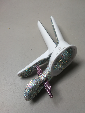 PROTOTYPE Deze eendenbek vroeg ik mee aan de gyneacoloog nadat ik een IUI behandeling onderging. Ik wilde het klinische , de negatieve connotatie, weghalen uit het fertiliteitstraject en begon mijn injectiespuiten, hormonen etc te beglitteren met strassstenen. De oorsprong van Fertility ; artistic research naar werking van kunst bij een ziekteprocess en/of behandeling.