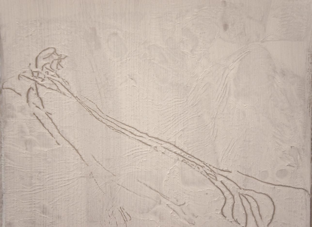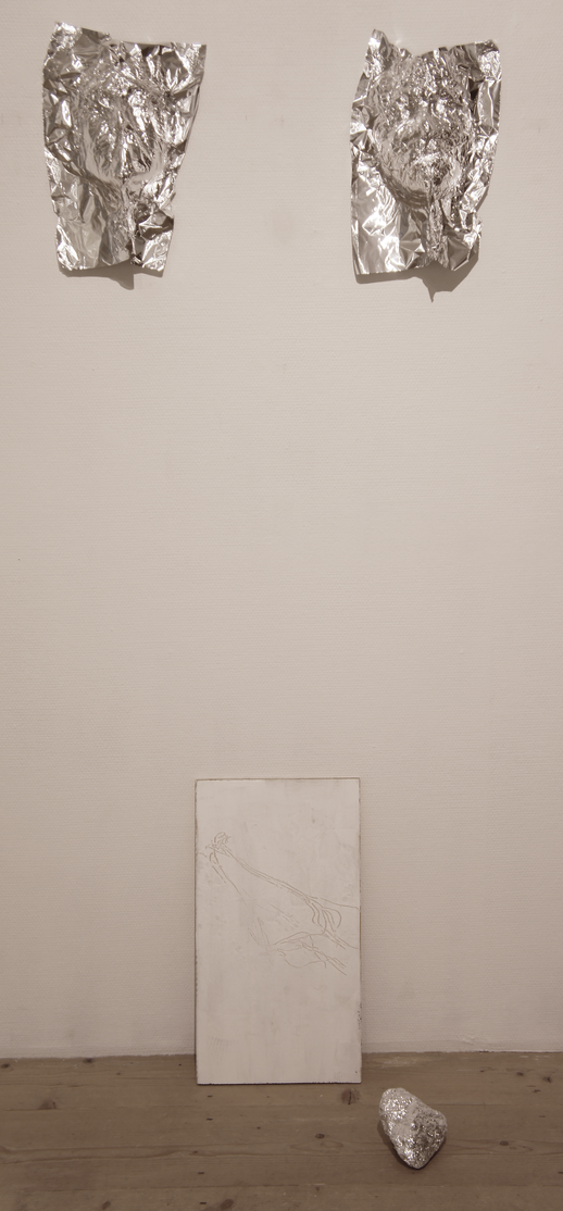 Surrogate Viewer is a supplement facing ex-. It consists of two face prints on aluminum paper, acrylic painting on wood (obviously a traced copy of a detail in one of the pencil drawings) and a rounded object wrapped in an aluminum paper (a stone? a heart? yes). This two-headed figure thematizes the position of the viewer in corporeal terms and questions the unity of that position.