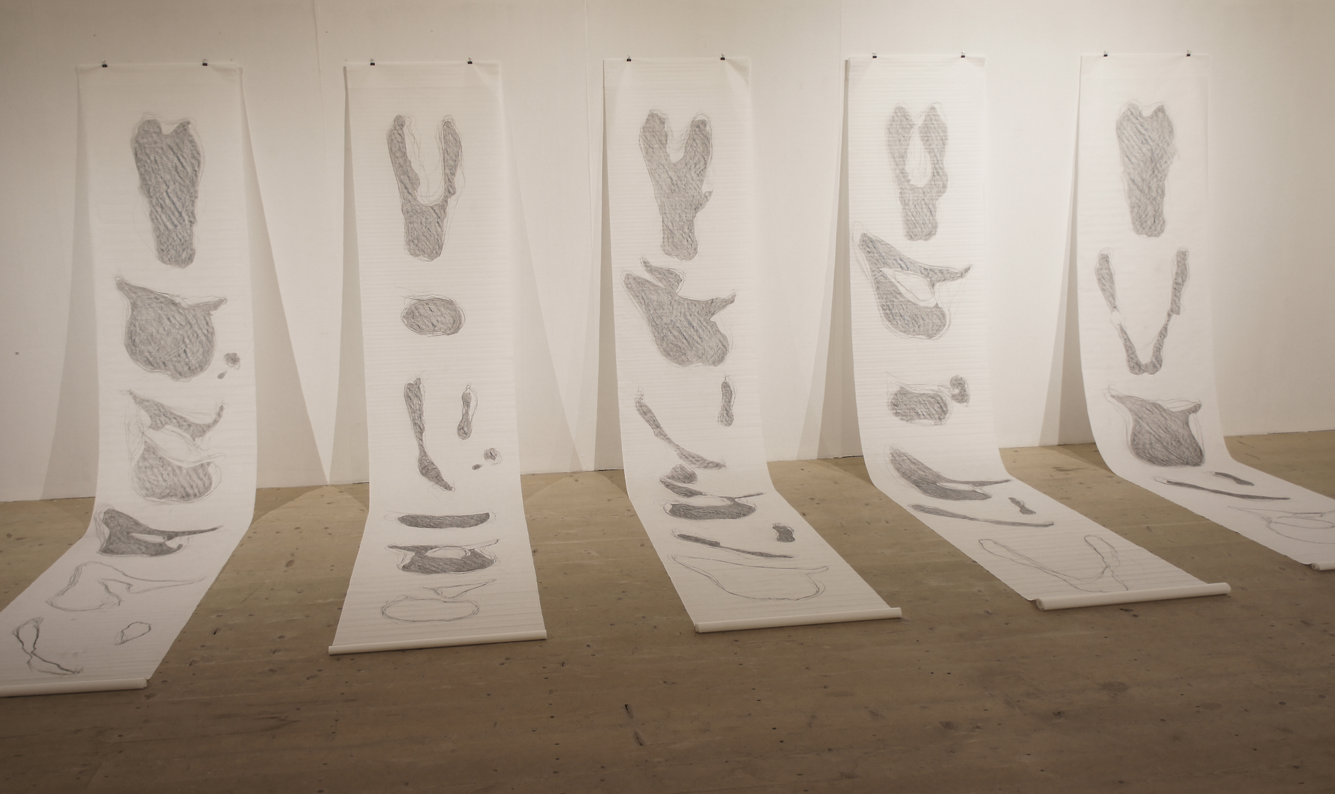 ex- consists of a series of pencil drawings that document five sequences of body movements and static positions. Each paper roll shows a series of shapes. On a closer look, each of them appears to be a sequence, a temporal process starting from the top. During the process of drawing, I was sitting on the paper in different positions and traced the outlines of those parts of my body that were touching the ground. I then filled the shapes with a pencil from the subsequent position (that is why the last outlines remain empty). Finally, frottage on the top of the pencil drawing traces the floor texture of the space where the work was made. I believe that all of this is readable from the drawings themselves. Following the lines carefully and pondering the degree of control at different areas you might even figure out that the person behind these gestures is a left-hander.