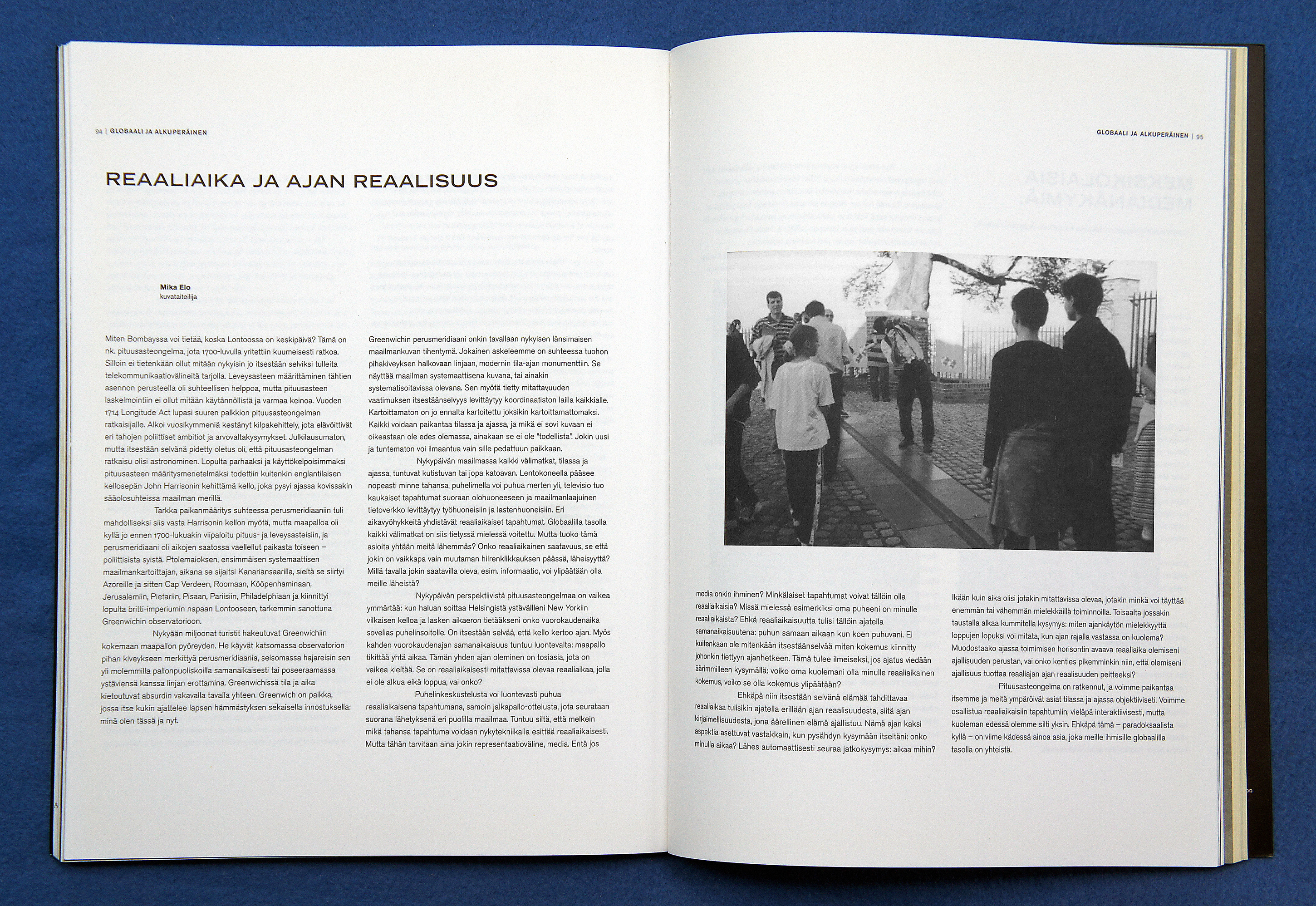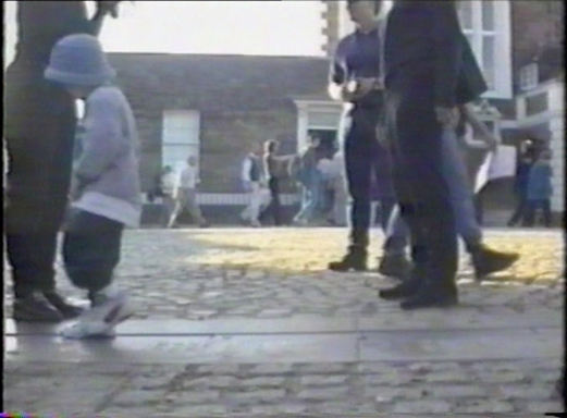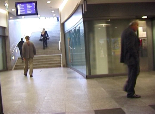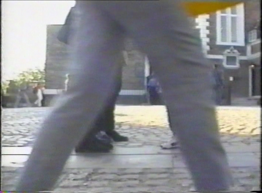 Especially one detail in Longitude + Solitude (1997) strikes me today: The only cut in the second part of the video (top left) and the ending of the whole piece (bottom left) find their timing in accordance with human pace. Feet touching the ground mark the finite space-time of the video clip. Within the horizon of Longitude + Solitude these cuts as well as the video transitions and the disjointed soundtrack of the first part of the video obviously reflect the discursively recognizable thematic anchor of the work: the paradoxical intersection of physical and mental time zones epitomized by people photographing each other and themselves while standing on the longitude line marked in the pavement at Greenwich observatorium.