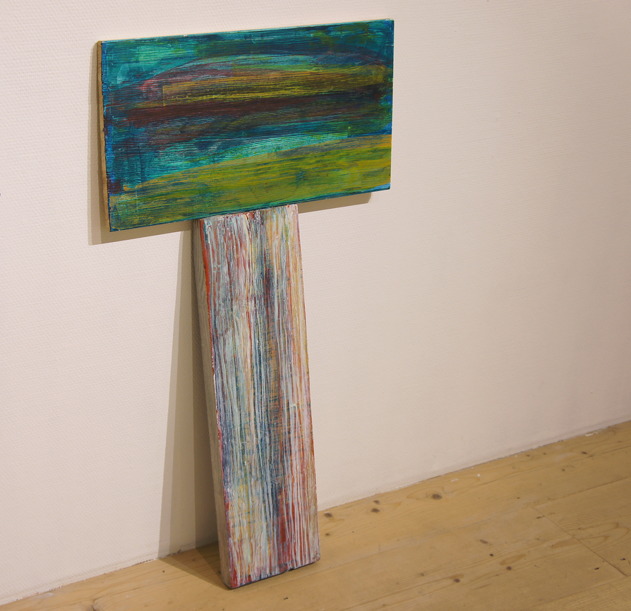 ...could have been a sculpture, an installation or a painting – or none of these and everything in-between. The juxtaposition of its two parts underlined this in-betweeness in terms of weight and balance. It was too unstable in order to stand alone. It needed support and was therefore leaning against the wall. It was hanging around at the wall as if it were looking for a proper position. Its colours occupied an intermediary space as well: The acrylic paint in its upper part, which, in a sense, had managed to install itself on the wall, was applied to the wood in such a way that the filaments made up the visual texture of its surface. In its lower part, in its rootless trunk, the painted strokes mimiced the filaments of the wooden ground. It seemed to be one of these objects that...