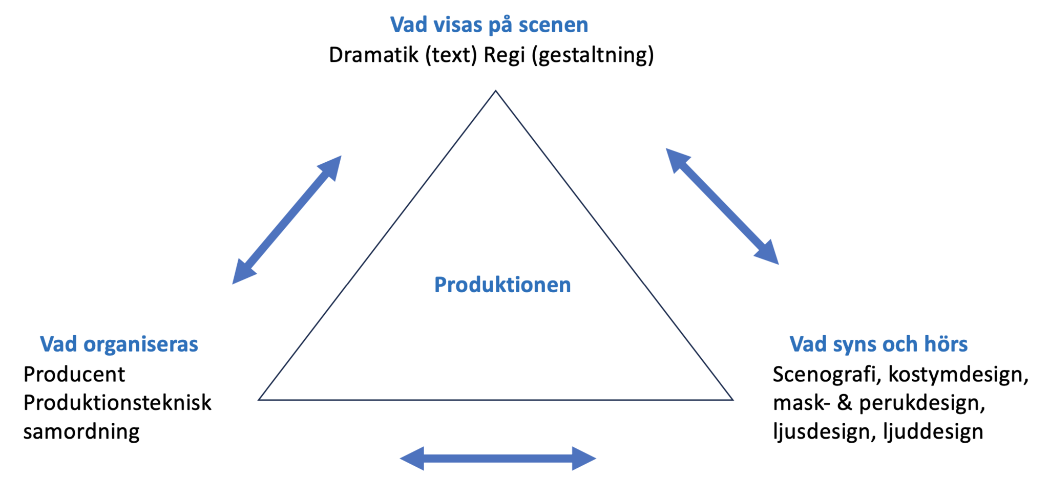 Detta för oss in på den andra modellen som i stället utgörs av en triangel som får representera en annan typ av systematisering och organisation av en scenkonstprocess. Liksom i den förra modellen är scenkonstproduktionen i centrum – här i mitten av triangeln, men där de olika ämnesområdena i den förra modellen var jämt fördelade längs cirkelbågen är de i den här modellen i stället i denna triangel fördelade i tre grupper under rubrikerna ”Vad visas på scenen”, ”Vad syns och hörs (på scenen)” samt ”Vad och hur organiseras produktionen/processen”.
