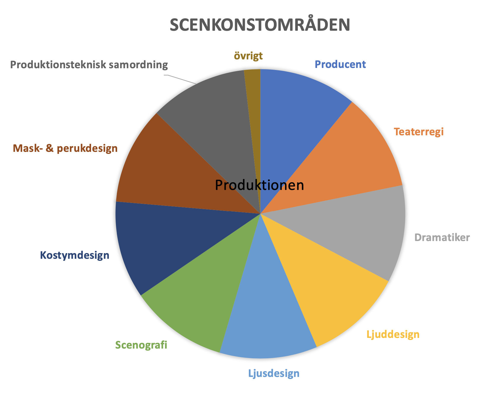 och gestaltningen att göra – dvs främst dramatiker/dramaturger och regissör. Under rubriken ”Vad syns och hörs” återfinner vi samtliga designfunktioner. Den tredje och sista rubriken, ”vad organiseras”, täcker in i huvudsak de styrande och systematiserande funktionerna som scenkonstproducenter och produktionstekniska samordnare utgör.