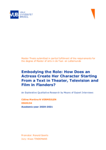 Een thesis/ onderzoek over hoe Vlaamse actrices hun rol creëren in theater en film. Het is een onderzoek waarbij er verschillende actrices (van verschillende theaterscholen) zijn geïnterviewd over zij aan de slag gaan met verscheidene acteertechnieken en stijlen. Deze bron wilde ik gebruiken om een beter beeld te krijgen over hoe actrices in een rol kruipen ook al voelt deze soms oncomfortabel aan. Als ik het proces begrijp van hoe het vormen van een rol tot stand komt, kan ik ook beter begrijpen waar het mis kan lopen.