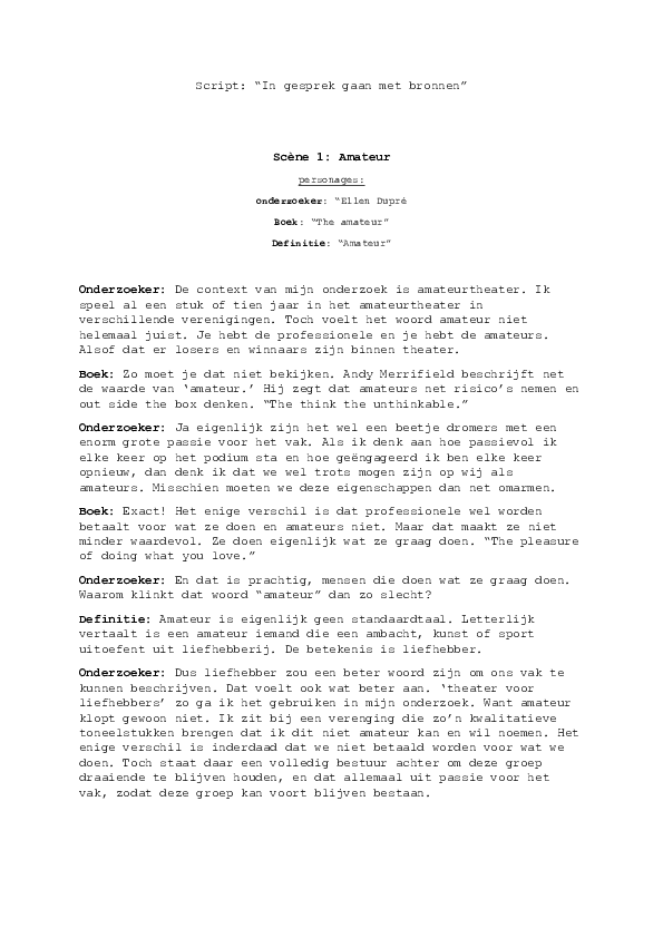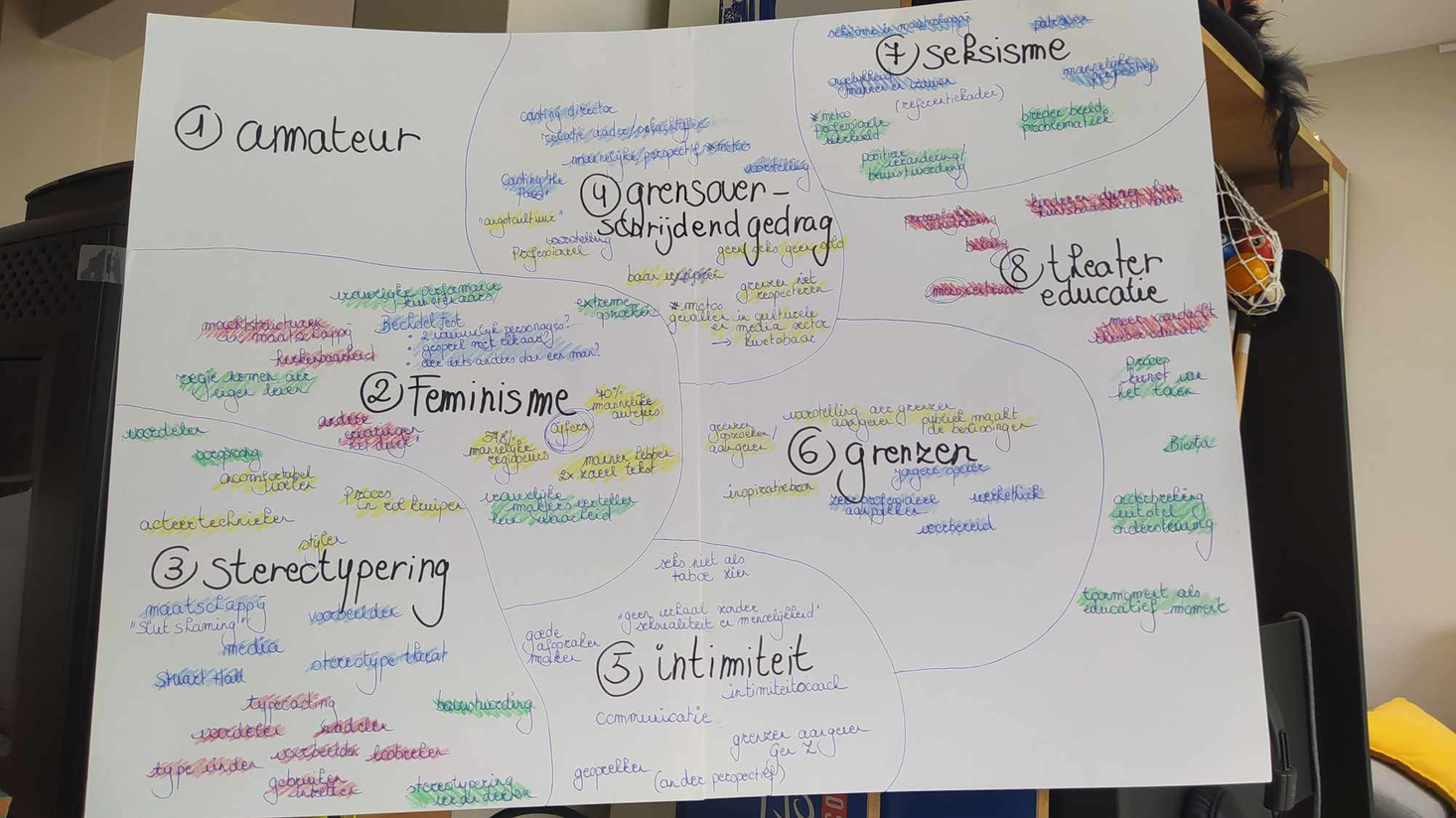 Ik merkte een enorme weerstand bij het verwerken van de bronnen, omdat ik geen schrijver ben. Ik ben een maker en speler en werk dus graag met mijn lichaam en stem, maar uren typen aan theoretische bronnen en deze kritisch benaderen is niet één van mijn sterkste punten en daar ben ik mij ook bewust van. Daarom raadde mijn onderzoeksbegeleider Emily mij aan om een vorm te zoeken die bij mij past. Een vorm waardoor ik terug plezier zou krijgen in het werken met bronnen. Na verschillende dingen uitproberen, van mindmaps maken tot filmpjes opnemen, heb ik een vorm gevonden die bij mij past. Ik ben geen theoretische schrijver, maar ik heb wel ontdekt, ook door het maken van de voorstelling, dat ik scripts schrijven wel fijn vindt. Zo heb ik mijn bronnen dan ook benadert. Ik heb mijn bronnen onderverdeelt in verschillende scènes, waarbij elke scène start met een kernwoord als onderwerp. De bronnen die ik gebruik voor dat kernwoord, zijn de personages waar ik als onderzoeker mee in gesprek ga. Door deze manier van werken toe te passen kon ik mezelf kritischer opstellen als onderzoeker en was er ruimte voor een gesprek. Zeer letterlijk dan want ik ga letterlijk in gesprek met mijn bronnen om mijn inzichten te verwerken.