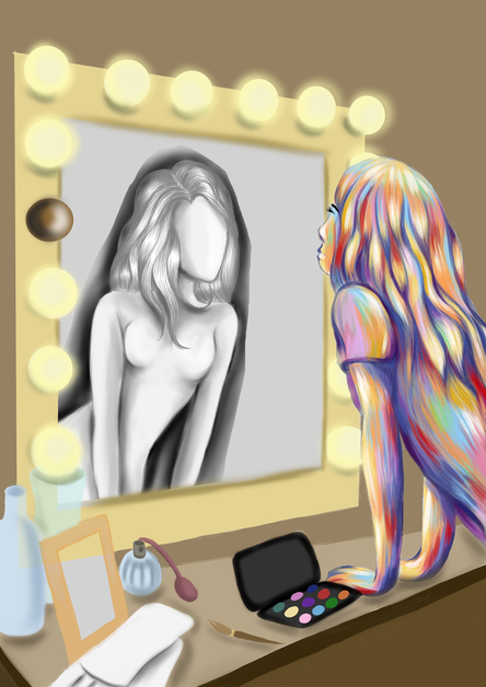 De voorstelling had natuurlijk ook een affiche nodig. Ook dit is een proces geweest van brainstormen, experimenteren, terugkoppelen en aanpassen. Omdat ik een deel van mijn beeldende kant als kunst educator wilde inzetten, heb ik besloten om zelf deze affiche vorm te geven. In één van onze gesprekken stelde Emelie voor om mijn gedachten en gevoelens die ik heb over de ervaring te tekenen om een beeld te krijgen van hoe het er in mijn hoofd aan toe gaat. Ik heb hier een eerste beeld rond gemaakt. (zie foto 1) Dit beeld toont de strijd tussen de actrice (grijze persoon) en het personage (kleurrijke persoon in de spiegel) dat ze speelt. Het is een afspiegeling van hoe zij zichzelf ziet. Emelie vond dit te letterlijk. Je ziet letterlijk een vrouw in lingerie en daardoor is alles te duidelijk. Het klopte ook niet dat het personage gekleurd was en de actrice grijs. Dit moest andersom volgens haar. De actrice is kleurrijk want zij heeft emoties en is sprekend. Het personage daarintegen is vlak en heeft geen emoties, een beetje zoals een poppetje van klei. Dan kwam ik bij tweede beeld uit. (zie foto 2) De omgeving rond haar is een normale theatrale omgeving. De actrice is kleurrijk en kijkt in de spiegel naar haar kleurloze spiegelbeeld. Toch voelde dit beeld ook niet helemaal juist. Dus besloot ik om de spiegel weg te halen en het statischer te maken. Het zijn nog steeds twee versies van een speler. De actrice zelf die een persoon is met kleur en emoties en daar tegenover het personage, dat een gevormd beeld is van hoe de maatschappij en regisseur haar willen zien op podium. Ze is kneedbaar. (zie foto 3).