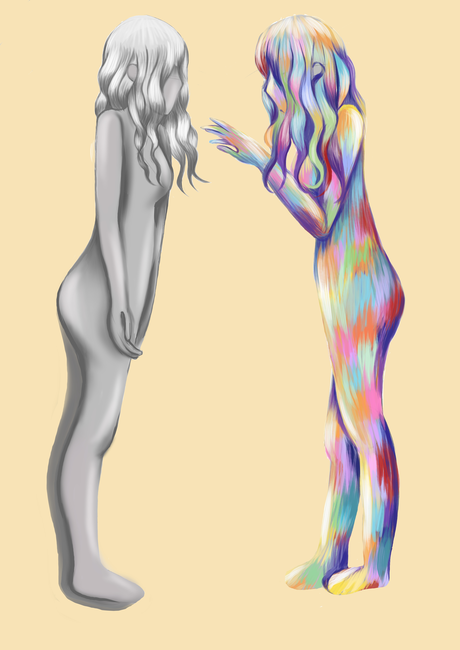 De voorstelling had natuurlijk ook een affiche nodig. Ook dit is een proces geweest van brainstormen, experimenteren, terugkoppelen en aanpassen. Omdat ik een deel van mijn beeldende kant als kunst educator wilde inzetten, heb ik besloten om zelf deze affiche vorm te geven. In één van onze gesprekken stelde Emelie voor om mijn gedachten en gevoelens die ik heb over de ervaring te tekenen om een beeld te krijgen van hoe het er in mijn hoofd aan toe gaat. Ik heb hier een eerste beeld rond gemaakt. (zie foto 1) Dit beeld toont de strijd tussen de actrice (grijze persoon) en het personage (kleurrijke persoon in de spiegel) dat ze speelt. Het is een afspiegeling van hoe zij zichzelf ziet. Emelie vond dit te letterlijk. Je ziet letterlijk een vrouw in lingerie en daardoor is alles te duidelijk. Het klopte ook niet dat het personage gekleurd was en de actrice grijs. Dit moest andersom volgens haar. De actrice is kleurrijk want zij heeft emoties en is sprekend. Het personage daarintegen is vlak en heeft geen emoties, een beetje zoals een poppetje van klei. Dan kwam ik bij tweede beeld uit. (zie foto 2) De omgeving rond haar is een normale theatrale omgeving. De actrice is kleurrijk en kijkt in de spiegel naar haar kleurloze spiegelbeeld. Toch voelde dit beeld ook niet helemaal juist. Dus besloot ik om de spiegel weg te halen en het statischer te maken. Het zijn nog steeds twee versies van een speler. De actrice zelf die een persoon is met kleur en emoties en daar tegenover het personage, dat een gevormd beeld is van hoe de maatschappij en regisseur haar willen zien op podium. Ze is kneedbaar. (zie foto 3).