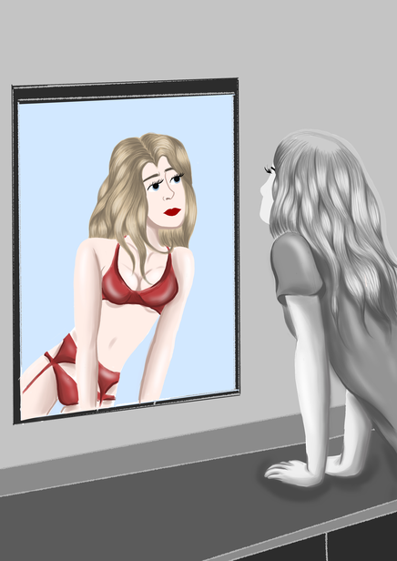 De voorstelling had natuurlijk ook een affiche nodig. Ook dit is een proces geweest van brainstormen, experimenteren, terugkoppelen en aanpassen. Omdat ik een deel van mijn beeldende kant als kunst educator wilde inzetten, heb ik besloten om zelf deze affiche vorm te geven. In één van onze gesprekken stelde Emelie voor om mijn gedachten en gevoelens die ik heb over de ervaring te tekenen om een beeld te krijgen van hoe het er in mijn hoofd aan toe gaat. Ik heb hier een eerste beeld rond gemaakt. (zie foto 1) Dit beeld toont de strijd tussen de actrice (grijze persoon) en het personage (kleurrijke persoon in de spiegel) dat ze speelt. Het is een afspiegeling van hoe zij zichzelf ziet. Emelie vond dit te letterlijk. Je ziet letterlijk een vrouw in lingerie en daardoor is alles te duidelijk. Het klopte ook niet dat het personage gekleurd was en de actrice grijs. Dit moest andersom volgens haar. De actrice is kleurrijk want zij heeft emoties en is sprekend. Het personage daarintegen is vlak en heeft geen emoties, een beetje zoals een poppetje van klei. Dan kwam ik bij tweede beeld uit. (zie foto 2) De omgeving rond haar is een normale theatrale omgeving. De actrice is kleurrijk en kijkt in de spiegel naar haar kleurloze spiegelbeeld. Toch voelde dit beeld ook niet helemaal juist. Dus besloot ik om de spiegel weg te halen en het statischer te maken. Het zijn nog steeds twee versies van een speler. De actrice zelf die een persoon is met kleur en emoties en daar tegenover het personage, dat een gevormd beeld is van hoe de maatschappij en regisseur haar willen zien op podium. Ze is kneedbaar. (zie foto 3).