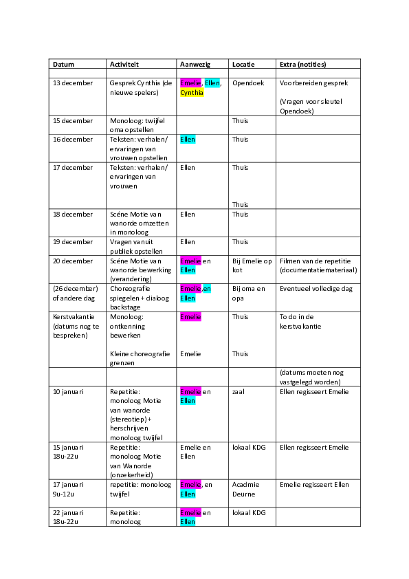 Na elke repetitie heb ik een verslag gemaakt met de belangrijkste oefeningen of inzichten in. Het verloop van een repetitie is hier ook duidelijk zichtbaar. Vanuit die verslagen heb ik de interessantste repetities geselecteerd als belangrijke schakelmomenten. Momenten waarop er een interessante verandering plaatsvond of wat een cruciaal moment was voor mijn onderzoek. Vanuit die verslagen heb ik schema’s gemaakt om de data van die repetities te analyseren. Dit heb ik gedaan aan de hand van crafting methods (actors/objects, activities, documentation, data/knowledge en reflection). Dit is een handige methode om het reflecteren van mijn data inzichtelijk te maken. Ik heb de belangrijkste inzichten hierin gemarkeerd waardoor ik weer een selectie kon maken voor mijn volgende stap.