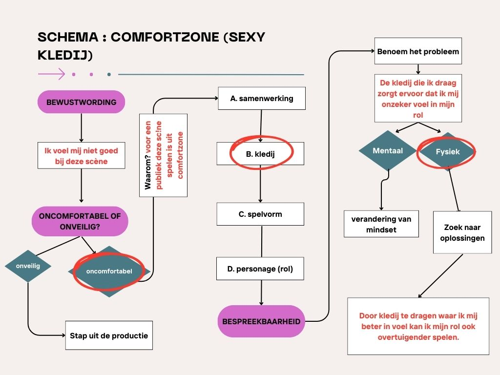 Een regisseur speelt een belangrijke rol dat is gebleken uit de vorige vraag, maar hoe zit dat bij de speler zelf? Een speler moet zijn grenzen kunnen aangeven. Dit wordt in verschillende gesprekken met studenten bevestigd. Zij zijn ervan overtuigd dat je het recht moet hebben om een uit een project te stappen als je er geen fijn gevoel bij hebt. Toch kan een rol niet fijn aanvoelen, omdat er bijvoorbeeld uit de comfortzone gestapt moet worden zonder een manier van onveiligheid te ervaren. Daar is het gesprek met Violet Breackman zeer waardevol in geweest. Zij gaf aan dat er een duidelijk verschil moet zijn in onveiligheid of je oncomfortabel voelen als speler.(V. Breakman, persoonlijke communicatie, 21 december 2023) Daarbij moeten spelers de ruimte hebben om hierover te communiceren. Violet is ervan overtuigd dat alles kan mits er goede afspraken worden gemaakt en erover gecommuniceerd wordt met de regisseur, medespelers,… Dit wordt ook bevestigd door  Janssens, P.(2023), intimiteitscoach in het Vlaamse medialandschap. Dit heb ik zelf ook ondervonden tijdens het repetitieproces. We zijn meerdere malen uit onze comfortzone gestapt maar door de open communicatie hebben we telkens een manier gevonden om hiermee te experimenteren tot we beide comfortabel genoeg waren om het te kunnen spelen. Toch is comfortabel bij iedereen anders. Wat goed voelt voor de ene, kan de ander bij blokkeren. Daarom de educatieve tool die ik hiernaast heb uitgewerkt.