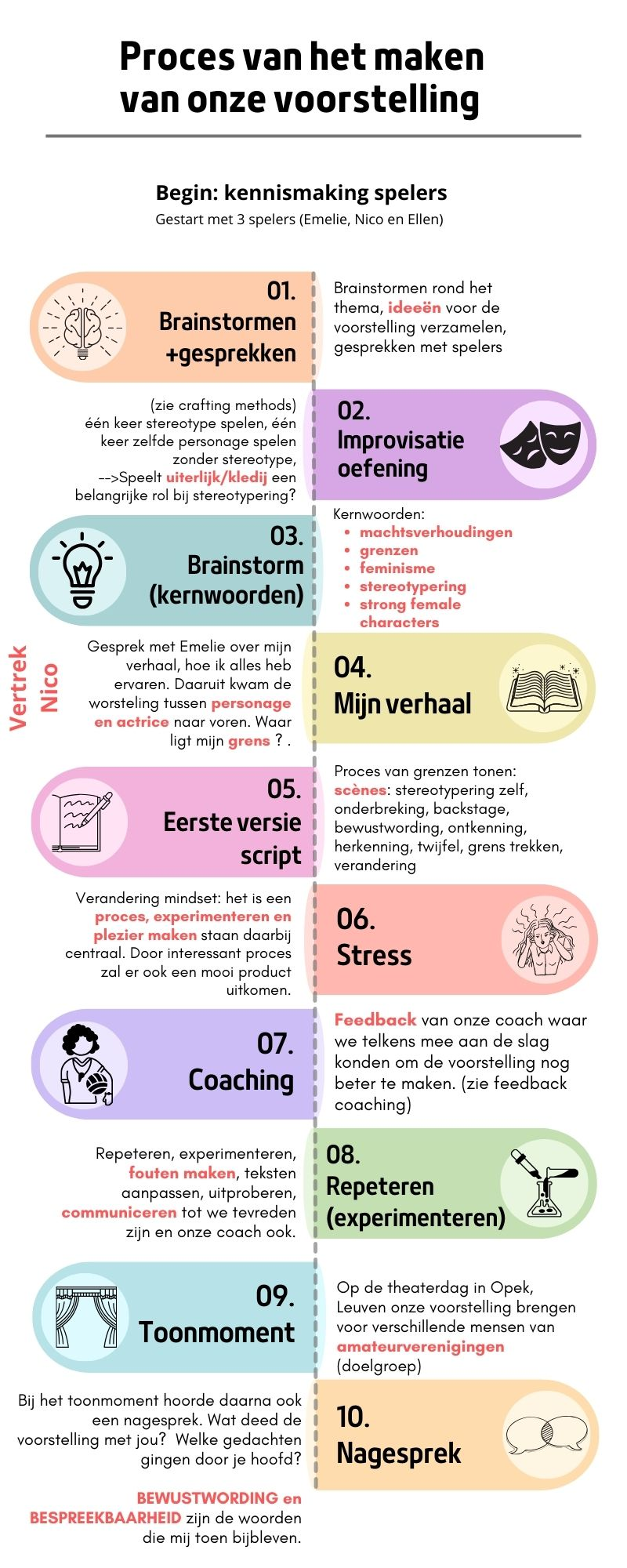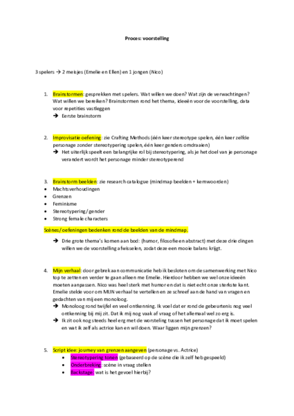 Voor ik mijn onderzoek startte was ik er zeker van dat ik iets wilde maken. Ik ben een speler in hart en nieren maar een voorstelling maken had ik nog nooit eerder gedaan. Daarom leek het mij de perfecte uitdaging en kans om dit uit te proberen. Met theater kan je iets in beweging zetten daarvan ben ik overtuigd. Je maakt ruimte om onderwerpen bespreekbaar te maken waar anders niet zo makkelijk over gepraat wordt. Dit was dus de perfecte vorm om een gesprek te starten. Uiteindelijk is het proces van het maken van de voorstelling een zeer belangrijk deel van mijn onderzoek geworden en heb ik daar de meeste data uit gehaald. Hieronder vindt je het verloop van dit proces en alle stappen die we hebben gezet om uiteindelijk tot onze voorstelling te kunnen komen. Bij 5.1 staan alle brainstorms van waaruit we vertrokken zijn. Daarna kan je best 5.2 lezen, hier ligt de kern van mijn praktijkonderzoek. De repetities zijn zeer waardevol geweest in dit proces en tot slot 5.3 de voorstelling zelf.