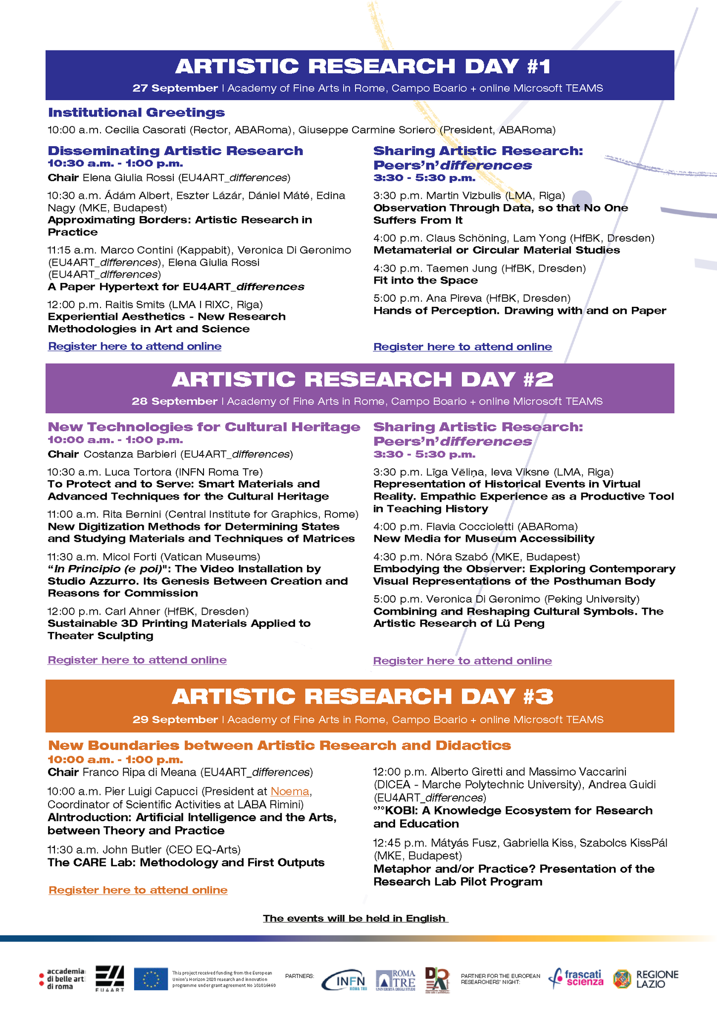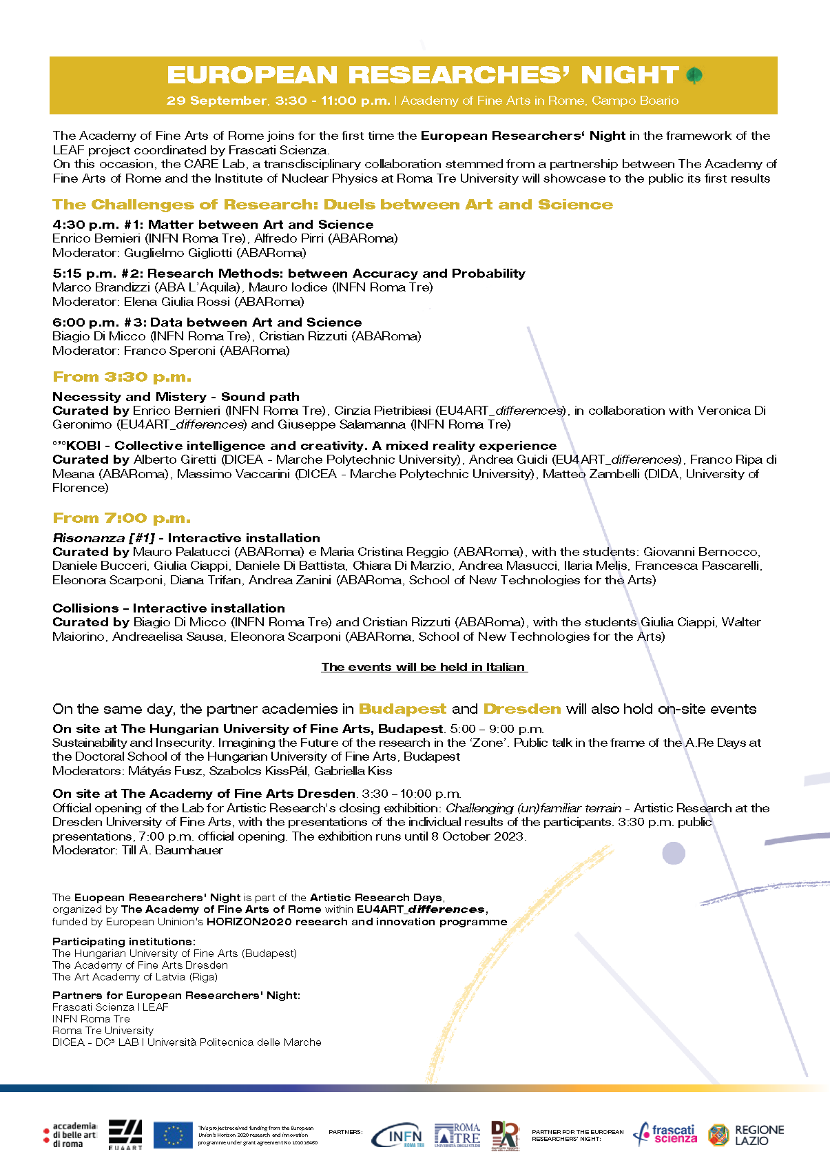 EU4ART_differences project is delighted to present the A.Re Days program. Three days dedicated to artistic research will celebrate the core projects developed by EU4ART_differences alliance through the course of the last three years, culminating in the European Researcher’s Night, on September 29, 2023.