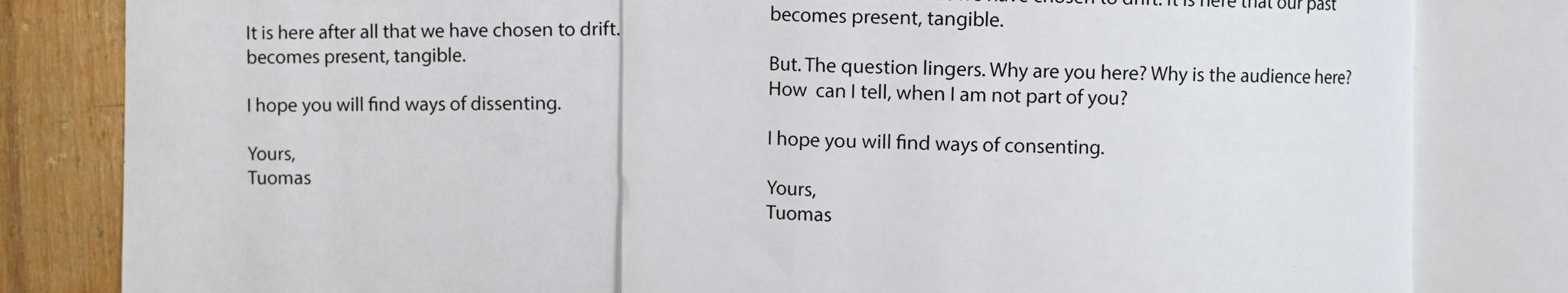 The theme of consent and dissent was inspired by Jacques Rancière's writing (Rancière, 2010), but it also reflected the uniform appearances of audiences in most performances that I attended. Audiences implicitly consented on everything that was asked of them: they entered the room when asked, sat where they were supposed to, followed the work in silence and clapped when it fit the convention. In a theatre play, no applause before the end, in a musical or a slapstick comedy, applause after each number (in the local context of Helsinki). When a performance would leave this kinds of issues unclear, the audience would feel uncertain. This happened for example in Joitakin keskusteluja merkityksestä (Eng. Some Conversations on Meaning, my translation) by Q-theatre. The performance style was situated somewhere in between a serious contemporary theatre work and a slapstick comedy. The audience, while seemingly enjoying the work a lot, was also indecisive with regard to the appropriate applause style. Applause would sometimes emerge, sometimes not, sometimes linger in between hesitantly. (Joitakin keskusteluja merkityksestä 22.9.2023)