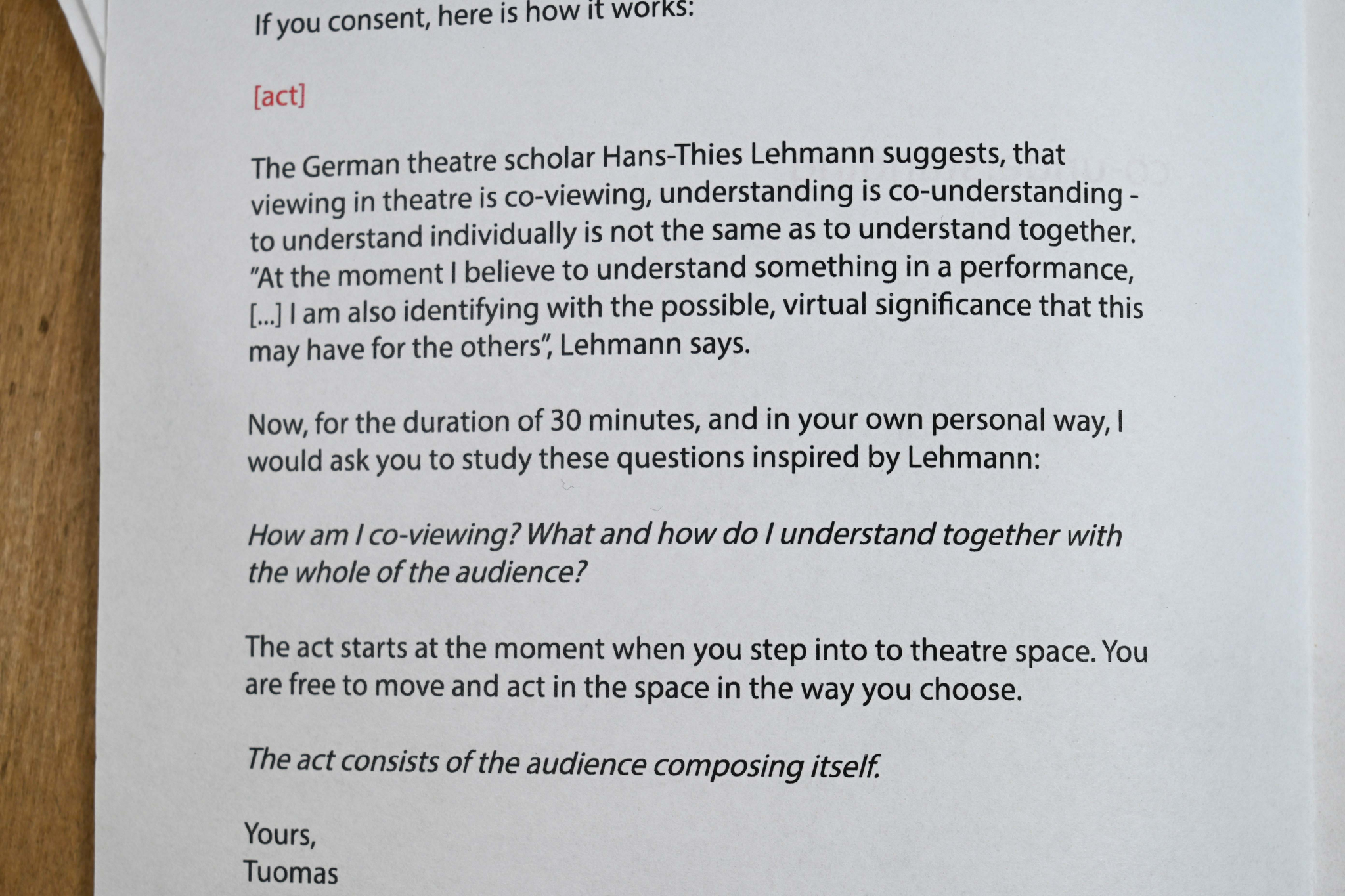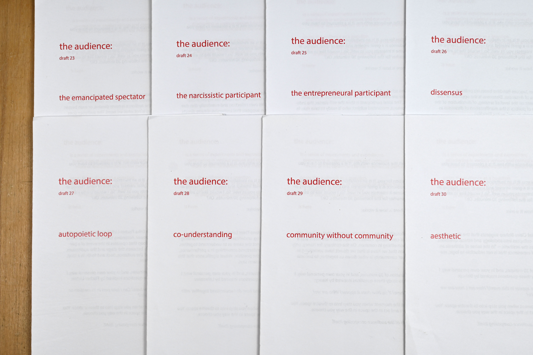 I prepared eight different handouts, each presenting a perspective on the phenomenon of the audience through a specific idea introduced by a theoretician. The Emancipated Spectator and Dissensus were inspired by Jacques Rancière (Rancière 2009, 2010), The Narcissistic Participant and The Entrepeneural Participant by Adam Alston (Alston 2016), Autopoietic Loop by Erika Fisher-Lichte (Fisher-Lichte 2008), Co-Understanding by Hans-Thies Lehmann (Lehmann 2009) Community without Community by Jean-Luc Nancy (Kurki 2005) and Aesthetic by Claire Bishop (Bishop 2012).