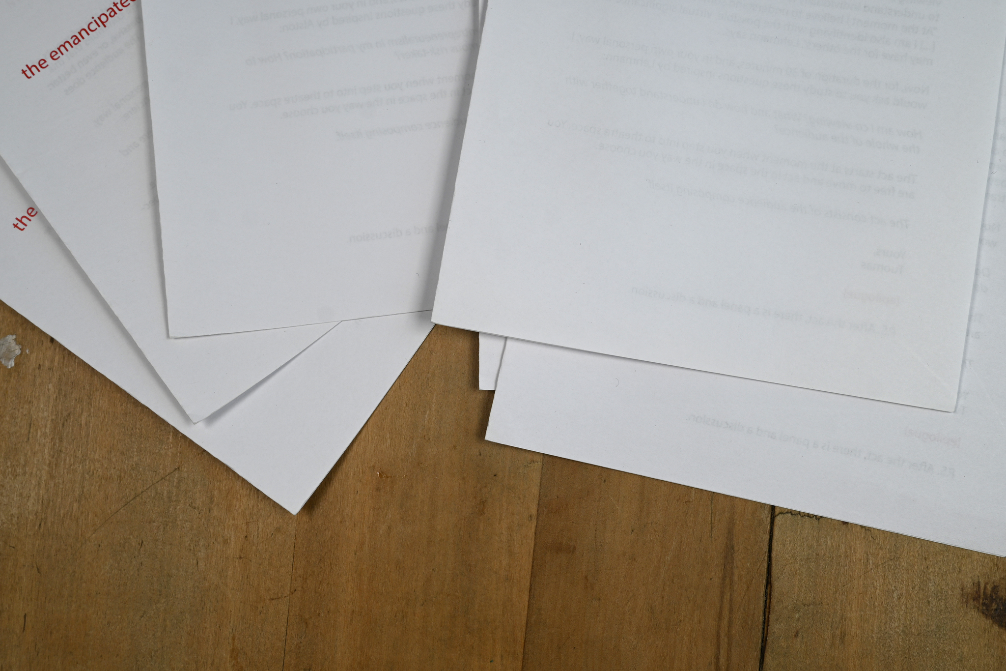 The programmes were laid on a table by the entrance of the theatre space. As the participants arrived, I asked each of them to choose one of the programmes based on its title and read it before entering the space. When everyone was ready, we entered simultaneously. Then there was 40 minutes of time unstructured by me. At first, the participants situated themselves silently in the auditorium which was at the end of the space close to the entrance. After a while someone moved on stage and looked back towards the others. Then there was more taking of different positions and after some 20 minutes, the curator Lilja opened a discussion, which started to dominate the situation and dismantle some of the effects of multipositionality created by the orientations. After the 40 minutes was up, I closed the session and opened a post-discussion.