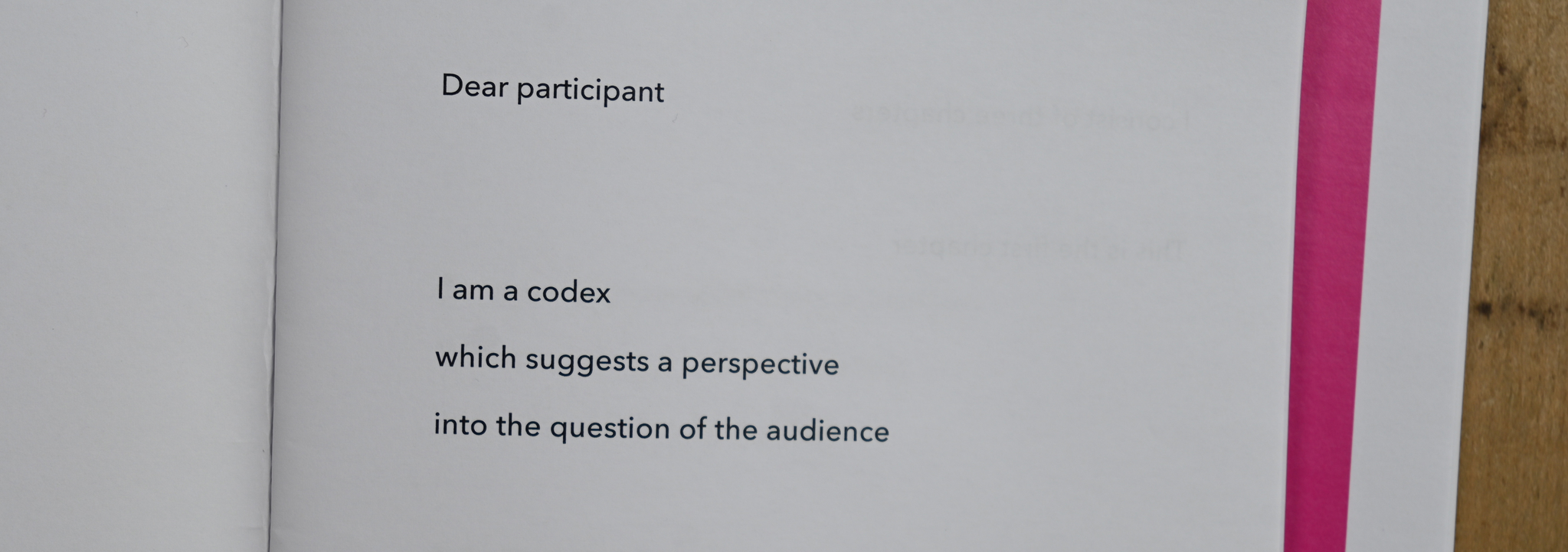Compared to my previous works, the Malmö booklet had a different version of the address. So far my texts had presented themselves as mediums, through which my (the author's) voice communicated with the audience. This time the book itself claimed to speak. The stack of papers was the subject, not just a conveyer of human thoughts. “I am a codex”, was written on the first page. One of the participants said in the feedback discussion that this flamboyant phrase gave a “religious” tone to the work. With the term codex, denoting the historical ancestor of the modern book, I wanted to draw attention to the format of a stack of pages attached from one side to each other, enabling the repetitive act of turning them over.