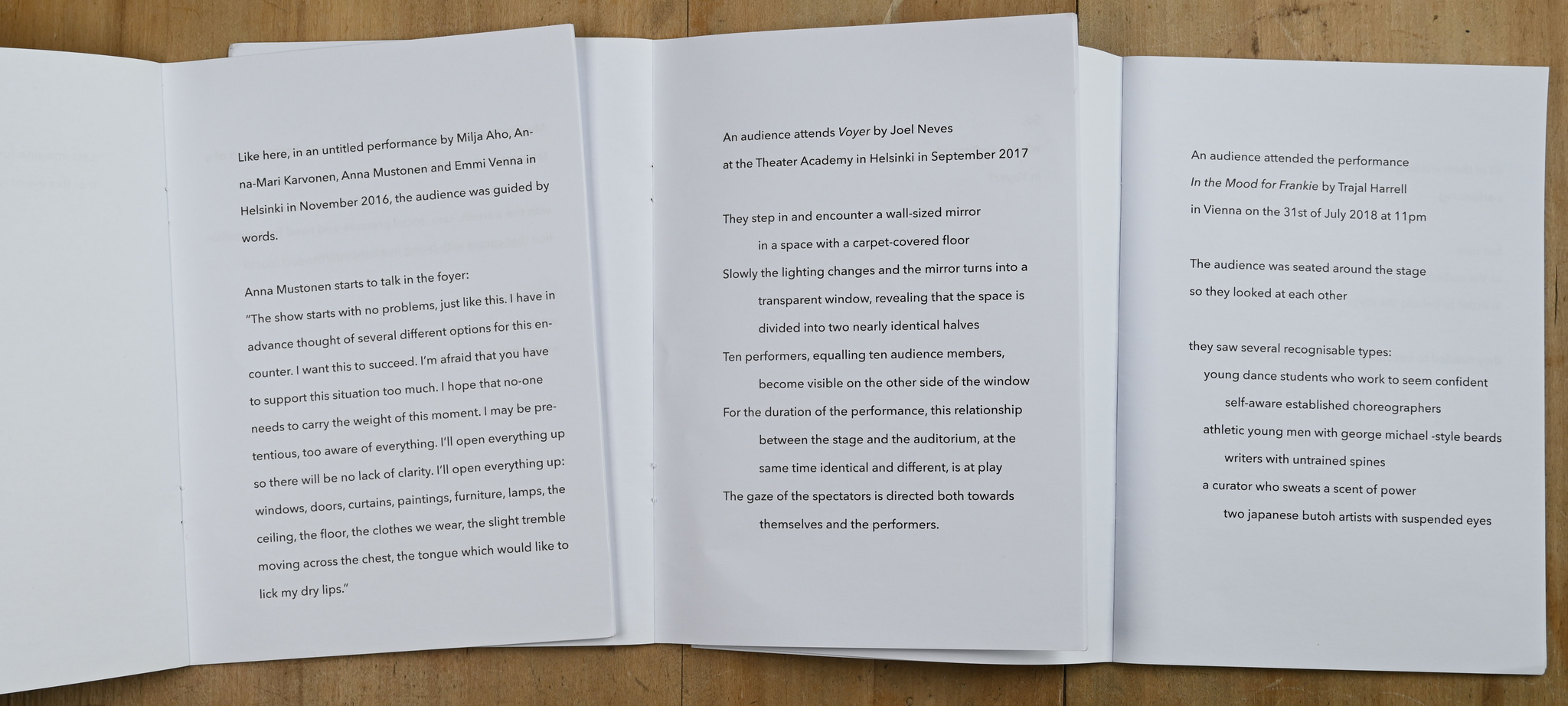Each of the three versions of the book had a different reference: Trajal Harrell’s In the Mood for Frankie (30.7.2018), Joel Teixeira Neves’s Voyer (26.9.2017) and an anonymous performance (29.4.2016 & 20.11.2016) by Milja Aho, Anna-Mari Karvonen, Anna Mustonen and Emmi Venna.