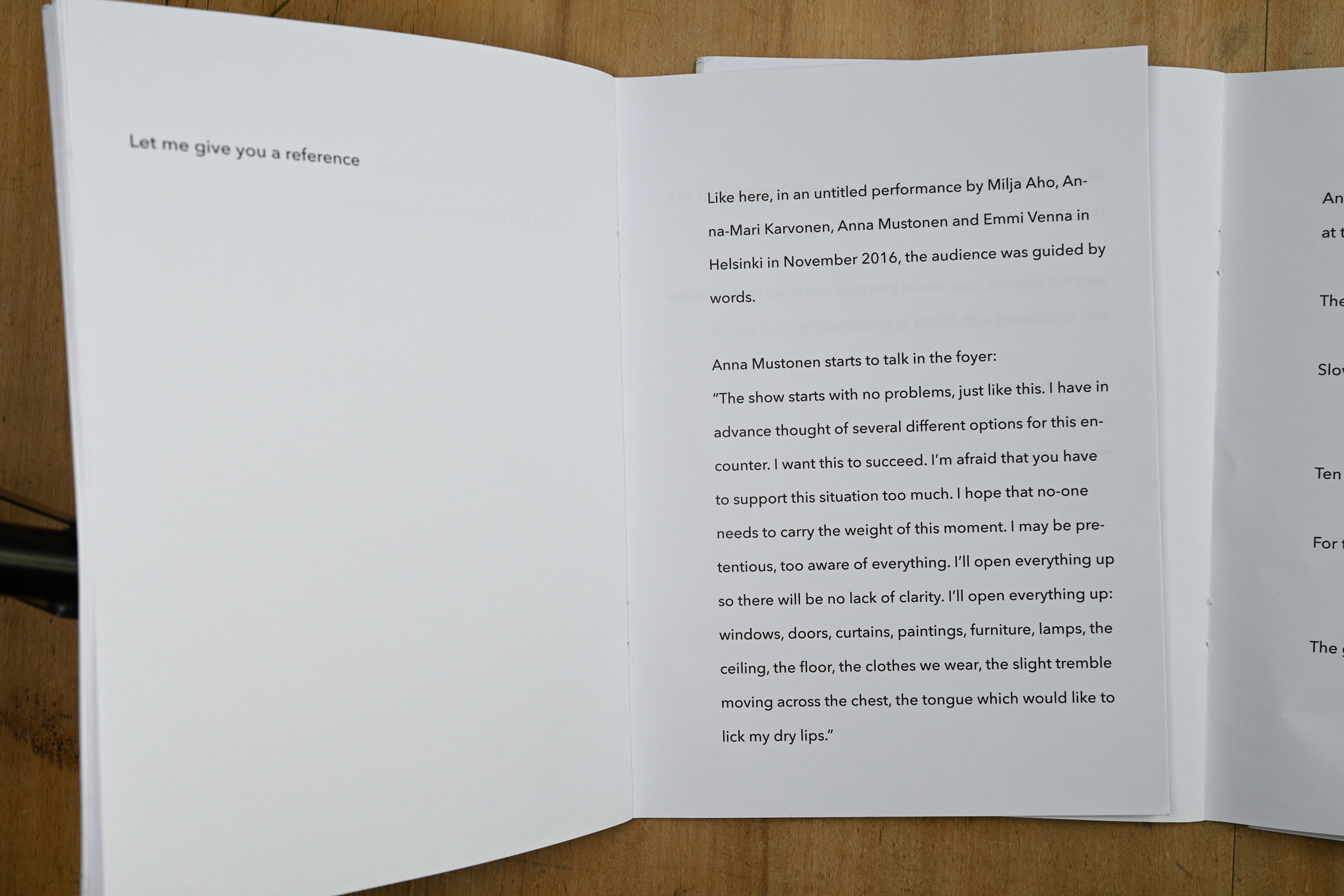 In the feedback discussion, I received critique on the materiality of the booklet. According to the feedback, it was not thought through or developed enough—just a basic stack of A4-papers stamped together. Could the materiality of the print be aligned with its content? Could it also take part in the thinking of the reading event? At the moment of receiving this critique, I felt misunderstood. Did they not see where my practice was situated? Why did they point to something unrelated or unimportant?