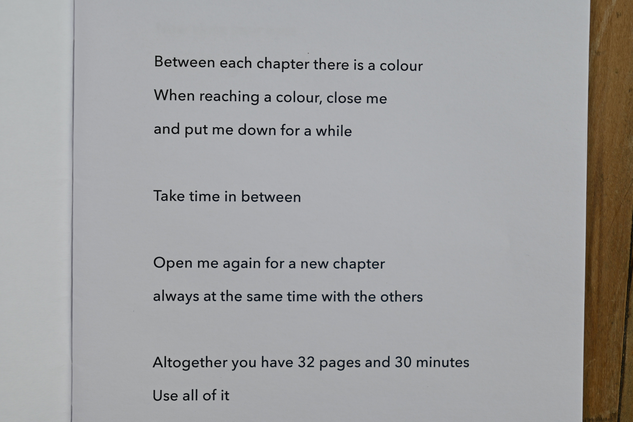 For the sixth draft I prepared three versions of a booklet, sticking with the A5-sized pages but increasing their number. The three versions had the same rhythm, but their content was partly different, in a way this was similar to the eight printed programmes of Draft 4. The cover text of each of the three versions were printed with a different colour (blue, yellow and pink), to signal to the participants that there were different versions.