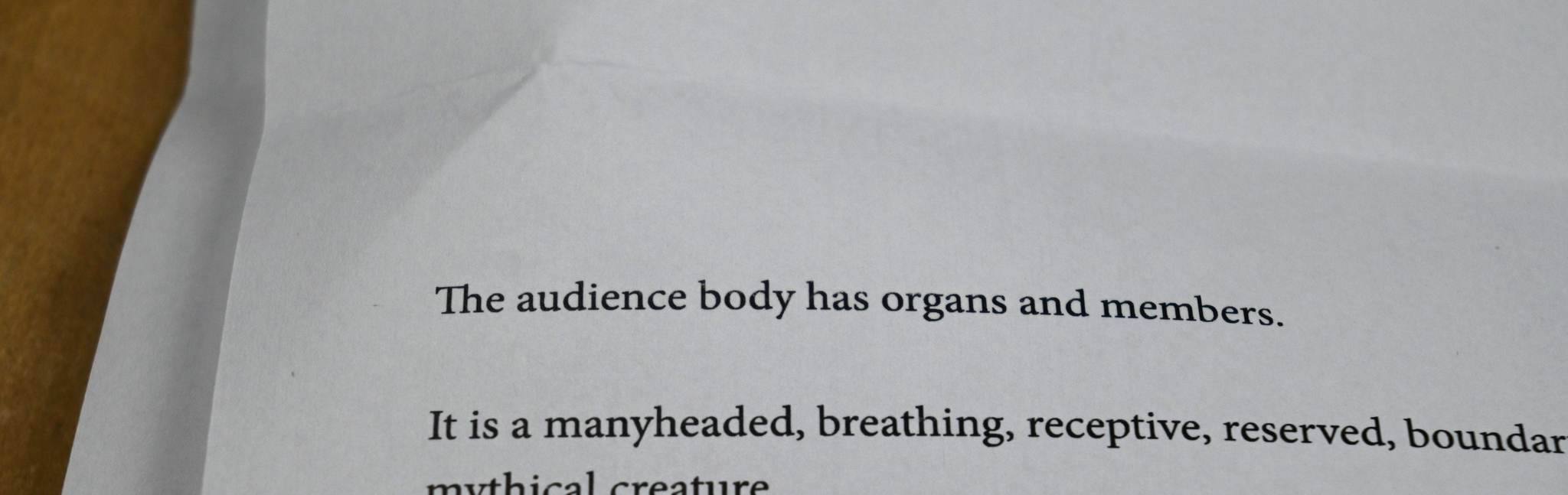 In the letters I introduced the idea of an audience as a collective body. “The audience body looks into the space through the eyes of its members.” The letter throws out several ambiguous proposals: that the audience body “thinks as presence, transfers of attention, relations”, it is a “shared force”, a “possible monster” (Sofaer, 2009) or the “ghost of performance”. The audience body would later become a central concept of my research and the title of the second examined artistic part of the doctorate.