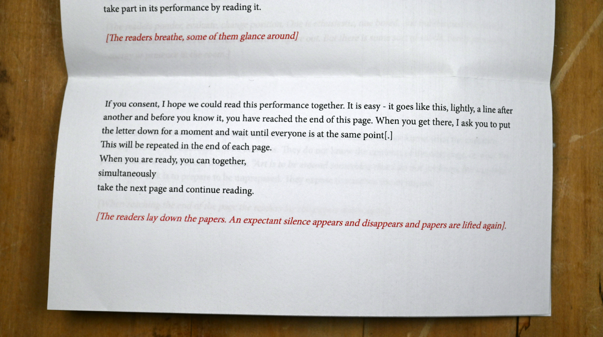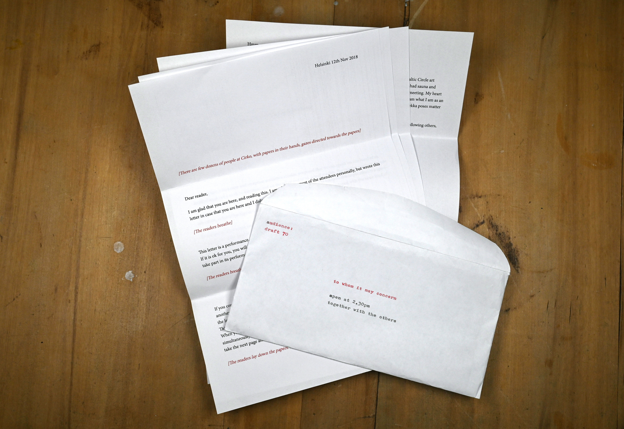 This letter had four A4-sized pages, each printed on one side and folded twice so that each page was divided into three sections by the horizontal lines of the folds. When folded this way, the letter fit into a 110x220mm envelope. This structured the content of the letter. Four pages became four parts of the performance and I used this to pace the collective reading: the letter instructed the readers to take a break at the end of each page and wait for everyone to finish it before turning the next. The folds further divided each page into three parts and I emphasized this by leaving empty lines between these sections.