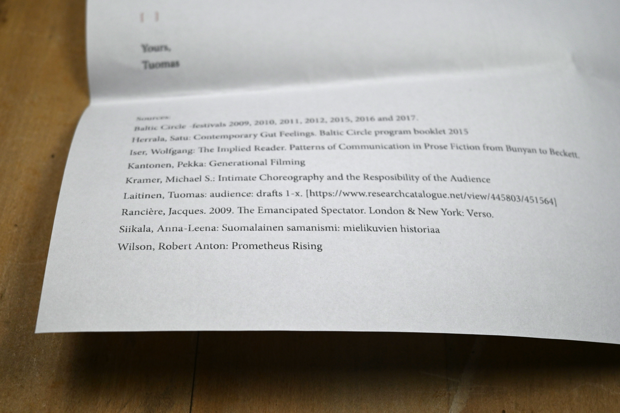 Reading of the letter was in turn the liminoid space itself. The intertwining of the personal (the parts of text that the reader could recognize as custom-made for themselves only) and the shared (the act of turning the page together) enabled a collective and intimate experience of a condition outside of the everyday. The reader could also feel the time of this condition in their hands as there were less and less unread pages. The final page marked the end of liminality and the exit into the postliminal condition.