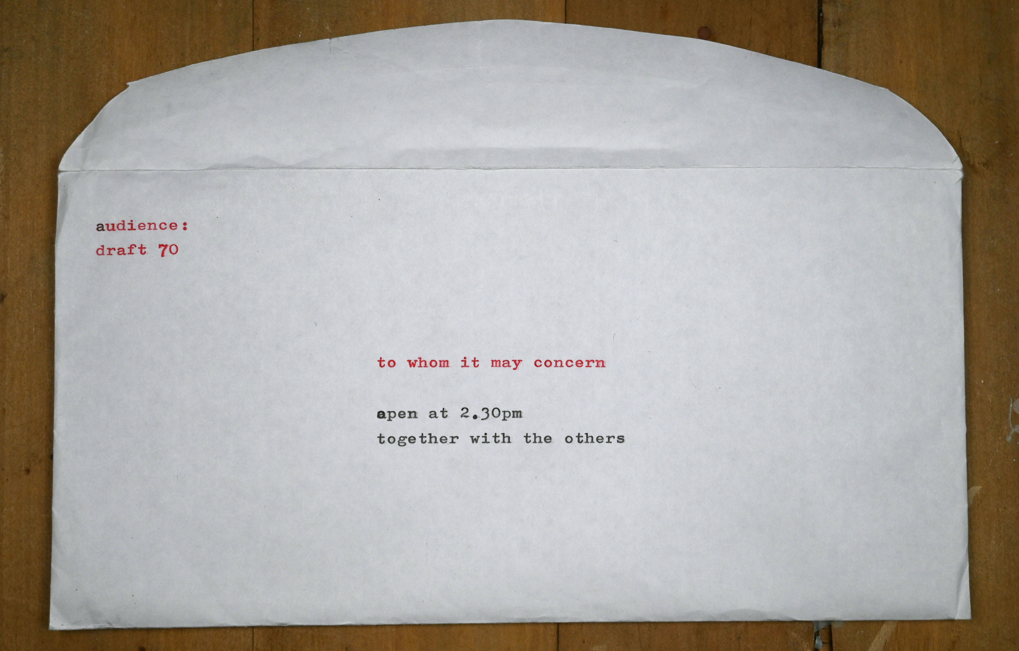 I used these methods (the reiterations of the collective pause in between the pages, the division of the text with pages and their folds, the limiting of the number of words and sentences) to control and ensure the emergence of a liminal dramaturgy. My aesthetic choices were governed foremost by the need to find a balance between the complicity of the audience and the asymmetric and subordinate relation between myself and them. I would continue iterating the medium of the letter in Drafts 11, 14, 15, 16, 17, 18, A Reading of Audience, Drafts 24, 25, 27 and the Audience Body.