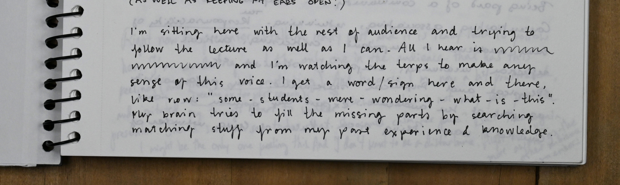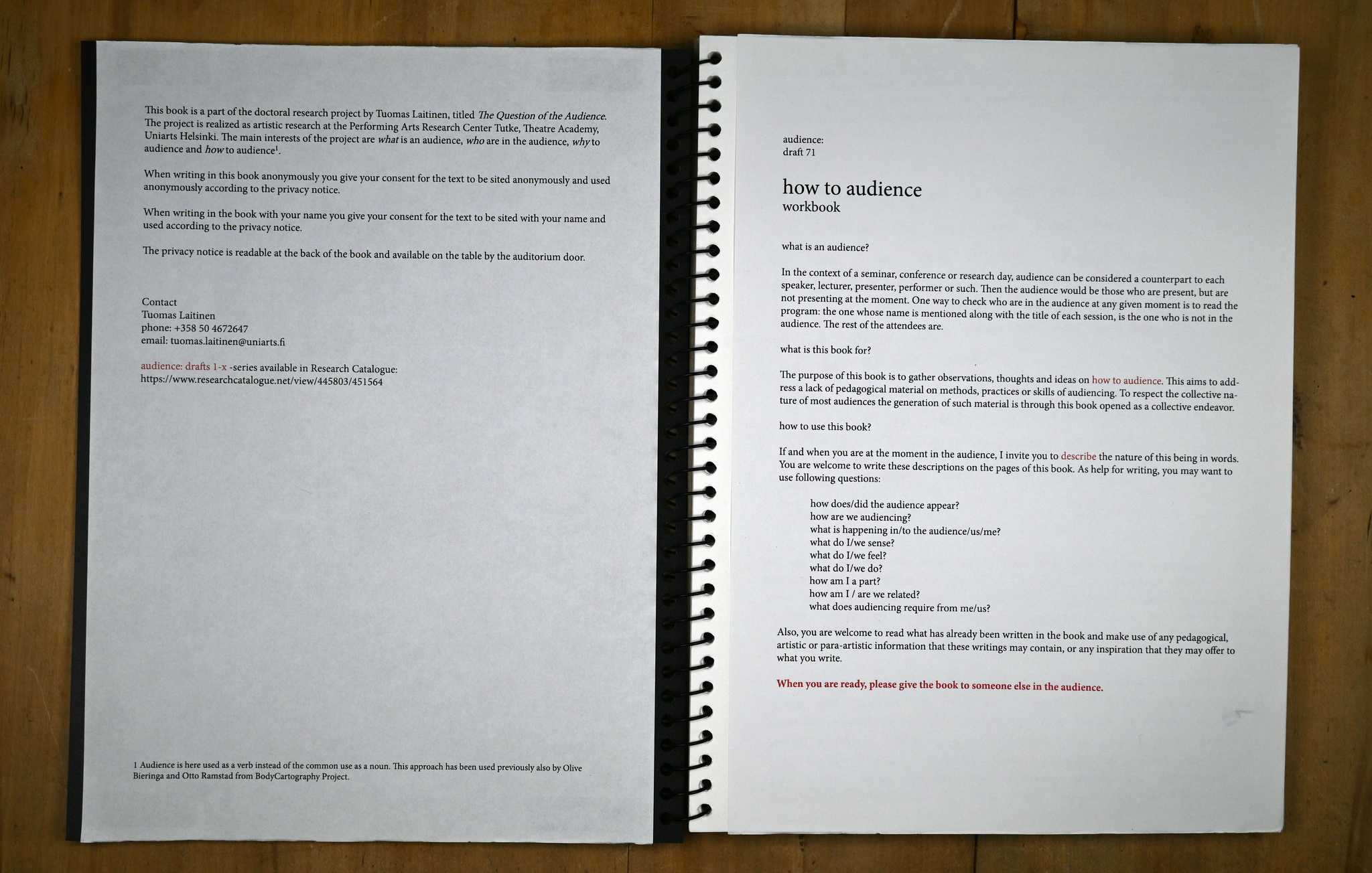 Like Draft 8, also Draft 10 used an already existing event as a context to collect material from informants. This time the context was not a theatre or dance performance but a research day organized by the research project How To Do Things with Performance by artistic researchers Annette Arlander, Tero Nauha, Hanna Järvinen and Pilvi Porkola. I had prepared a notebook with an invitation to describe the experience of being in the audience of the current event. At the beginning of the event, I gave the notebook to a member of the audience sitting in the end of one of the rows of seats. The book instructed the reader to give it to someone else once ready.